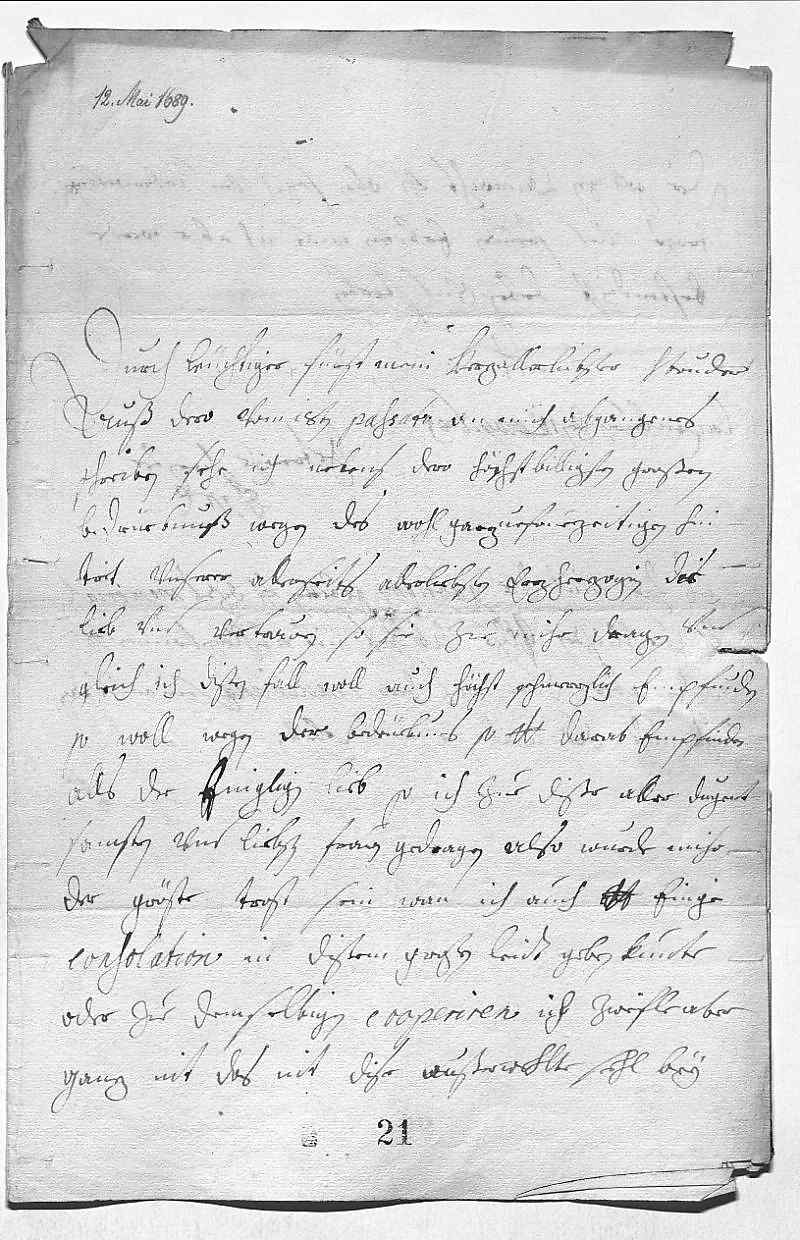 0001Durch leüchtiger Fürst, mein herzallerliebster herr bruder 0002Auß dero vom 18ten passato an mich abgangenes 0003schreiben sehe ich nebens dero höchstbiligsten großen 0004bedrüebnuß wegen des wohl garzuefruezeitigen hin- 0005trit vnserer allerseits allerliebsten Erzherzogin die 0006lieb vnd vertrawen, so sie zue mihr dragen. Vnd 0007gleich ich dißen fall woll auch höchst schmerzlich empfunden, 0008so woll wegen der bedrüebnus, so dero Liebden darab empfinden, 0009alls der inigligen lieb, so ich zue dißer aller dugent- 0010samsten vnd liebsten frawen gedragen. Also wurde mihr 0011der gröste trost sein, wan ich auch dero Liebden einige 0012consolation in dißem großen leidt geben kunte 0013oder zue demselbigen cooperiren. Ich zweifle aber 0014ganz nit, das nit dise außerwehlte sehl bey