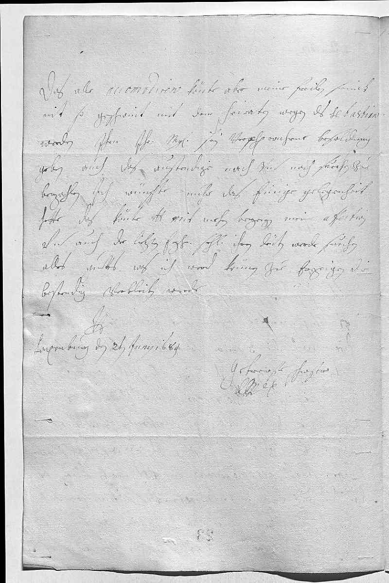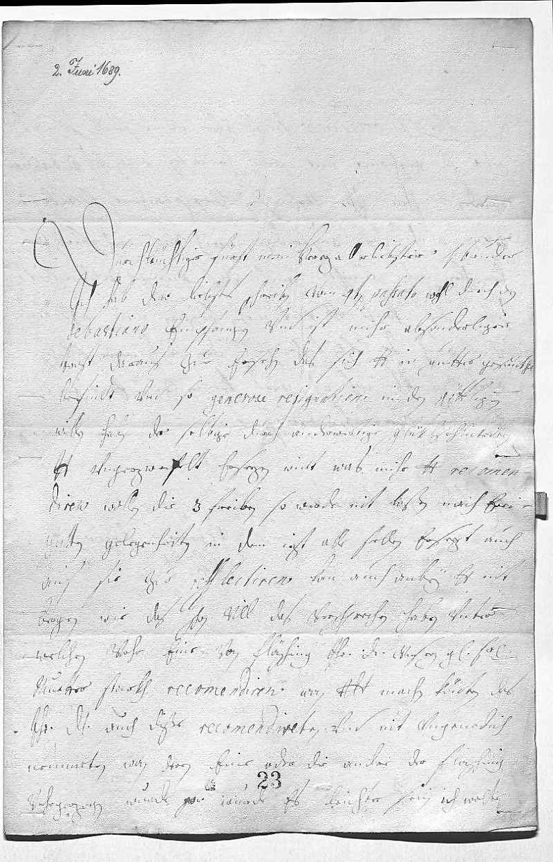 0001Durchleüchtiger Fürst, mein herzallerliebster herr bruder 0002Ich hab dero liebstes schreiben vom 4ten passato wohl durch den 0003Sebastiano empfangen. Vnd ist mihr absonderliger 0004trost, daraus zue ersehn, das sich dero Liebden in guetter gesuntheit0005befindt vnd so generose resignation in den göttligen 0006willen haben, der selbige durch anderweitige glükhsehlickeiten 0007dero Liebden vngezweifelt ersezen wirt. Was mihr dero Liebden recomen- 0008diren wollen, die 3 freilen, so werde nit laßen, nach einer 0009gutten gelegenheiten, in dem iezt alle stellen ersezt, auch 0010auf sie zue reflectiren. Kan auch anbey dero Liebden nit 0011bergen, wie das schon vill das verschprechen haben, vnter 0012welchen vohr eine von Fläsching ihr Durchlaucht, vnser geliebste fraw 0013muetter, starkh recomendiren. Wan dero Liebden machen könten, das 0014ihr Durchlaucht auch diße recomendireten vnd nit vngenedich 0015nemmeten, wan deren eine oder die andre der Fläsching 0016vohrgezogen wurde, so wurde es leichter sein. Ich wolte,