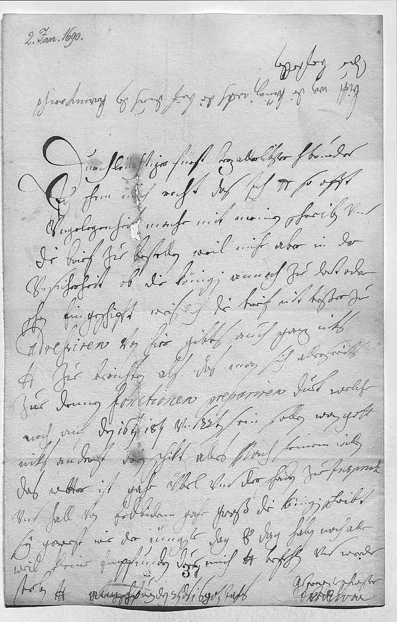 00011Bitt, wan die Königin wekh, die brief durch den Kramprecht 0002zue bestellen. 0003Durchleüchtiger Fürst, herzallerlibster herr brueder 0004Ich schem mich recht, das ich dero Liebden so offt 0005vngelegenheit mache mit meinen schreiben vnd 0006die brief zue bestellen. Weil mihr aber in der 0007vnsicherheit, ob die Königin annoch zue Dortrecht oder 0008schon eingeschifft, weis ich die brief nit beßer zue 0009adressiren. Von hier gibts auch ganz niks 0010dero Liebden zue berichten, als das man sich allerseits 0011zue dennen fonctionen prepariren duet, welche 0012noch auf den 16ten, 18ten vnd 22ten sein sollen, wan gott 0013niks anderst drein schikt, alles nach seinem willen. 0014Das wetter ist gahr übel vnd der schaden zue Inspruk 0015vnd Hall von erdbidem gahr groß. Die Königin schreibt, 0016sey gewest wie der iüngste dag, 8 dag haben noch alle 0017weil kleine empfunden. Due mich dero Liebden befehlen vnd werde 0018sterben, dero Liebden 0019getrewste schwester 0020Eleonora 0021Augschpurg den 2ten jenner des 1690ten jahrs