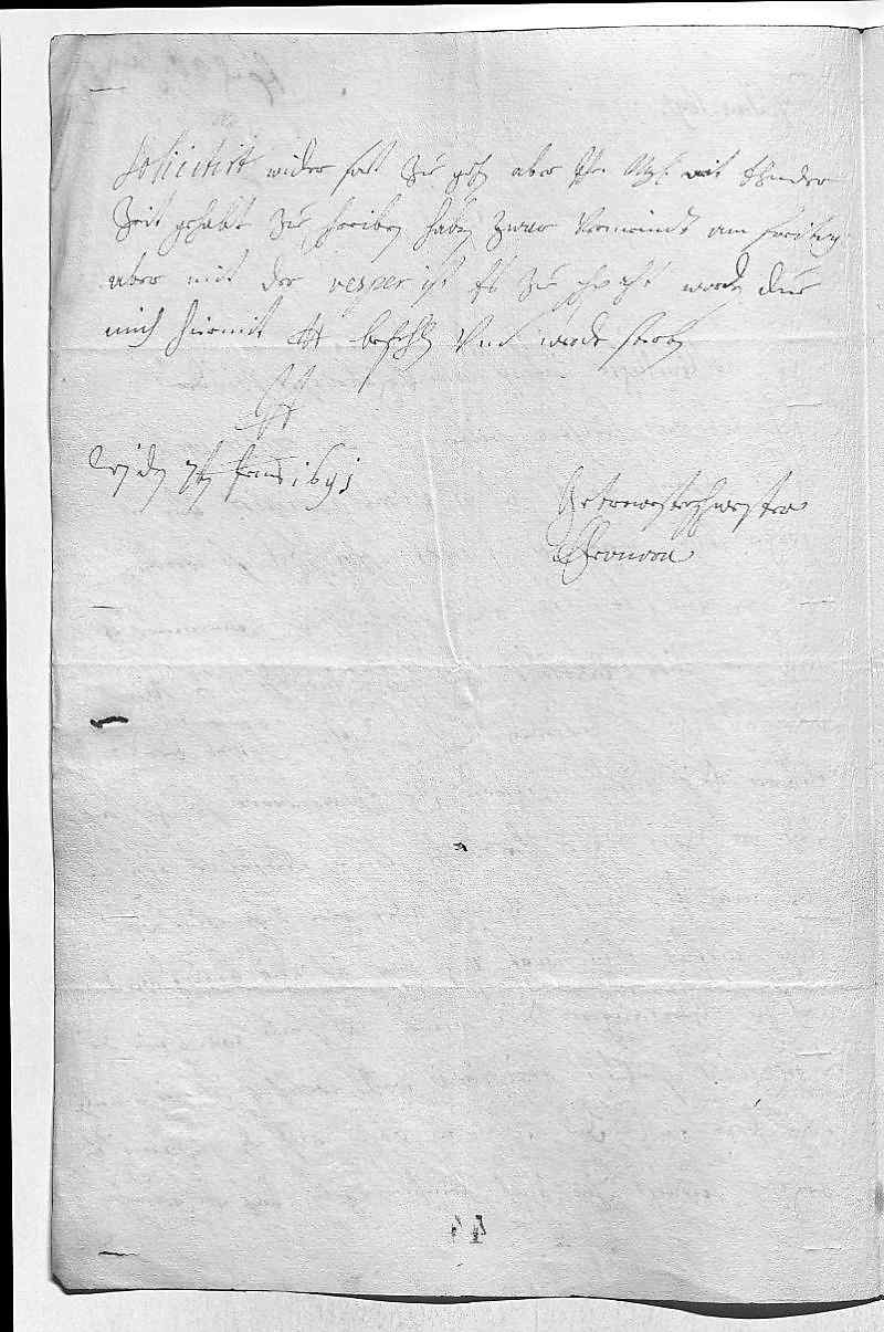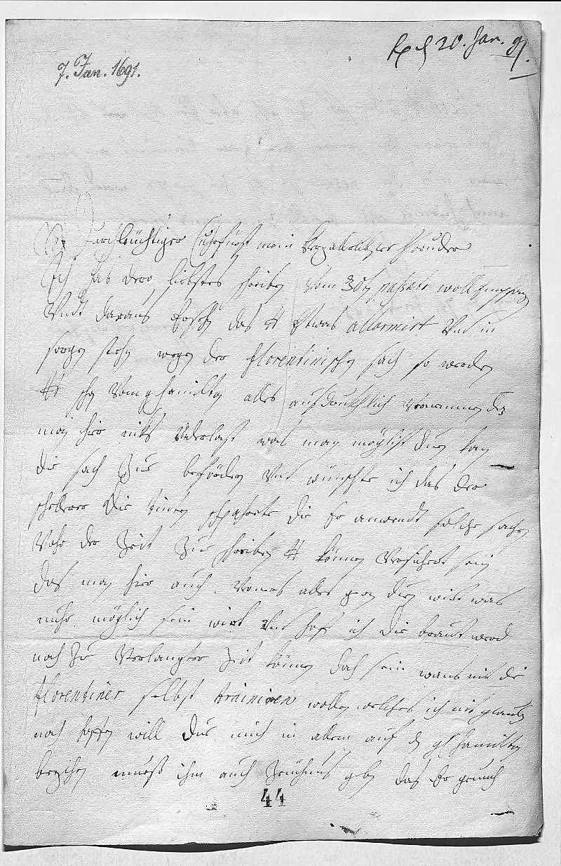 0001rp den 20.Januarij 910002Durchleüchtiger Cuhrfürst, mein herzallerlibster herr bruder 0003Ich hab dero liebstes schreiben vom 30ten passato woll empfangen 0004vndt daraus ersehen, das dero Liebden etwas allarmirt vnd in 0005sorgen stehen wegen der florentinischen sach. So werden 0006dero Liebden schon vom Grav Hamilton alles ausdrukhlich vernemmen, das 0007man hier niks vnderlast, was man möglist duen kan, 0008die sach zue befördern, vnd wünschte ich, das der 0009Schellerer die tinten schpahrete, die er anwendt, solche sachen 0010vohr der zeit zue schreiben. Dero Liebden können versichert sein, 0011das man hier auch verners alles gern duen wirt, was 0012nuhr möglich sein wirt, vnd hoff ich, die braut werd 0013noch zu verlangter zeit können dah sein, wans nit die 0014florentiner selbst trainiren wollen, welches ich nit glauben 0015noch hoffen will. Due mich in allem auf den Graven Hamilton 0016bezihen. Mueß ihm auch zeüchnus geben, das er genuch