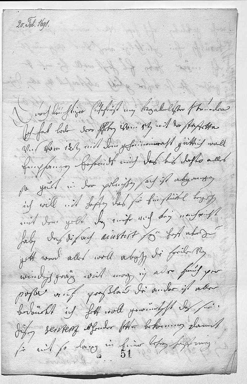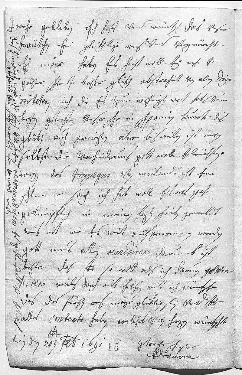 0015wehr gebliben. Ich hoff vnd wüntsch, das vnser 0016braütchen ein glükhlige reis vnd vergnüechte 0017eh möge haben. Es heist woll bey mihr, je 0018größer schelm, je beßer glükh. Abstrahirt von allen dig- 0019niteten, ich, die es zum wehnigsten wert, habs zum 0020besten getroffen. Vnser schwester in Schpanien kunte dis 0021glükh auch genießen, aber bisweilen ist man 0022selbst die verhindernus, gott wolle erleüchten. 0023Wegen des impegno von Meilandt, ist ein 0024schlimme sach, ich hab woll etwas gahr 0025gelimpflich in meinen lezten schreiben gemeldt, 0026weis nit, wie es wirt aufgenommen werden. 0027Gott mus allein remediren, darumb ist 0028beßer, das dero Liebden so woll als ich daruon abstra- 0029hiren, weils doch nit helfen wirt. Ich wüntsche, 0030das des Fürsten reis möge glüklich sein vnd dero Liebden 0031alles contento haben, welches von herzen wüntscht 0032dero Liebden 0033getrewste schwester 0034Eleonora 0035Wien den 20ten februarij 169100361Wegen des Humpüsch werd die sach ihr Mayestät bestens recomendiren. Es geht halt hie etwas 0037geschwint die sachen nemlich, wie dero Liebden woll wißen.