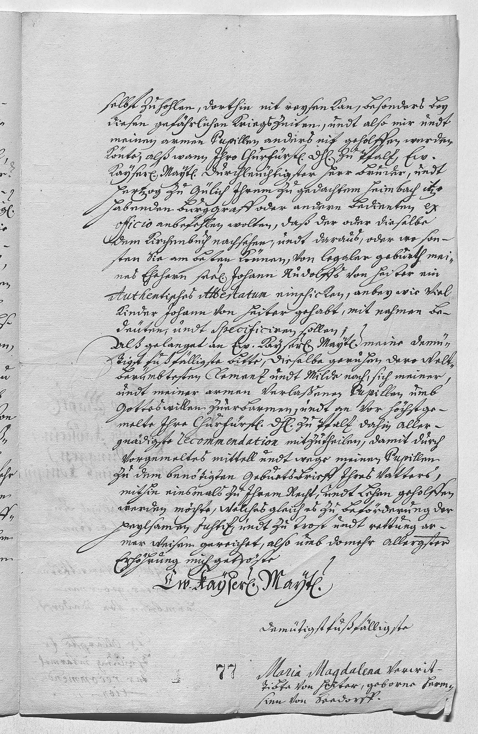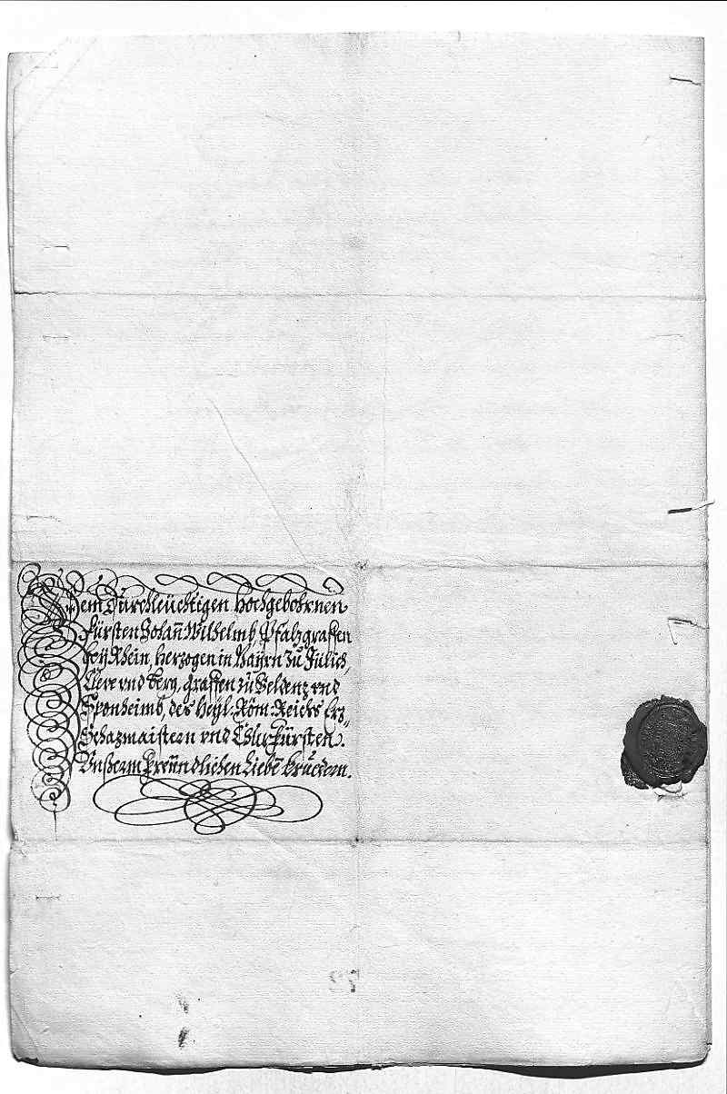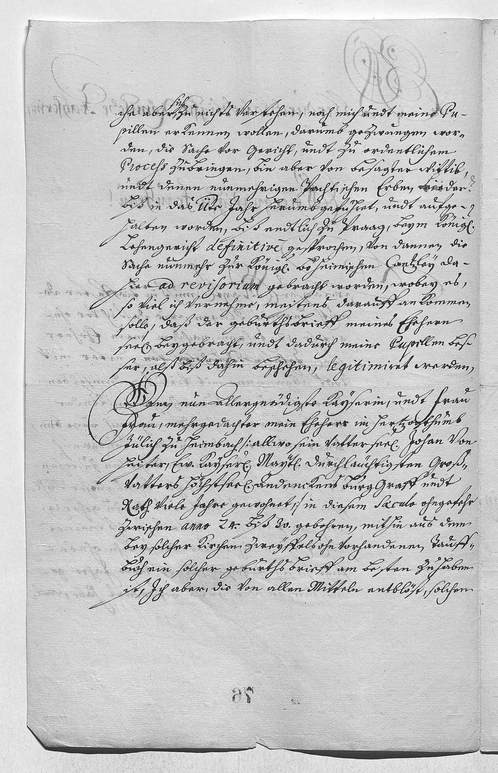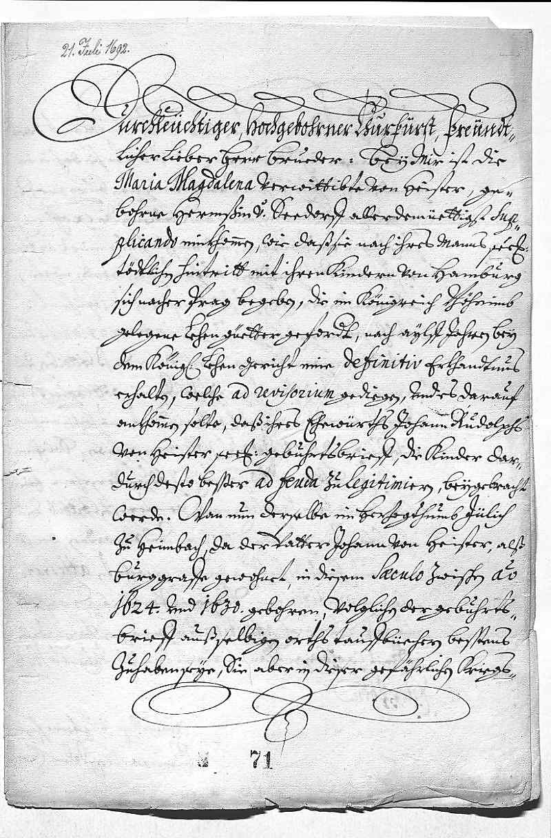 0001Durchleüchtiger, hochgebohrner Churfürst, freundt- 0002licher lieber herr brueder. Bey mir ist die 0003Maria Magdalena verwittibte von Heister, ge- 0004bohrne Hermßin von Seedorff, allerdemüettigst sup- 0005plicando einkhommen, wie daß sie nach ihres manns seeligen 0006tödtlichen hintritt mit ihren kindern von Hamburg 0007sich nacher Prag begeben, die im Königreich Böheimb 0008gelegene lehen güetter gefordert, nach aylff jahren bey 0009dem königlichen lehen gericht eine definitv erkhandtnus 0010erhalten, welche ad revisorium gediegen, vnd es darauf 0011ankhommen solte, daß ihres ehewürths Johann Rudolphs 0012von Heister seeligen gebuhrtsbrieff, die kinder dar- 0013durch desto besßer ad feuda zulegitimieren, beygebracht 0014werde. Wan nun derselbe im Herzogthumb Jülich 0015zu Heimbach, da der vatter Johann von Heister, alß 0016Burggraffe gewohnet, in diesem saeculo zwischen anno 00171624 vnd 1630 gebohren, volglichen der gebuhrts- 0018brieff auß selbigen orths tauffbüechern besstens 0019zuhaben seye, sie aber in dieser gefährlichen kriegs-