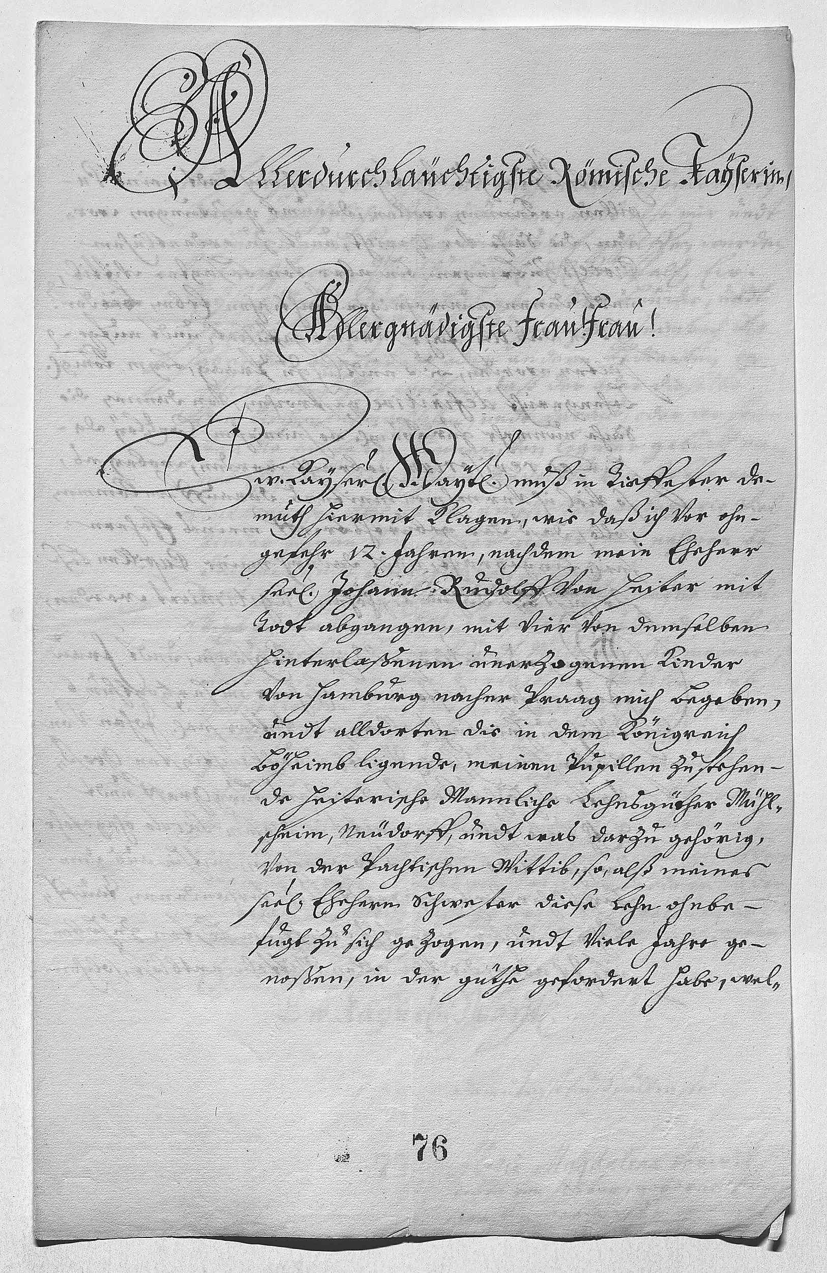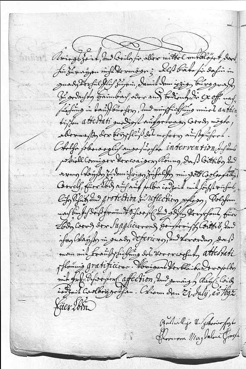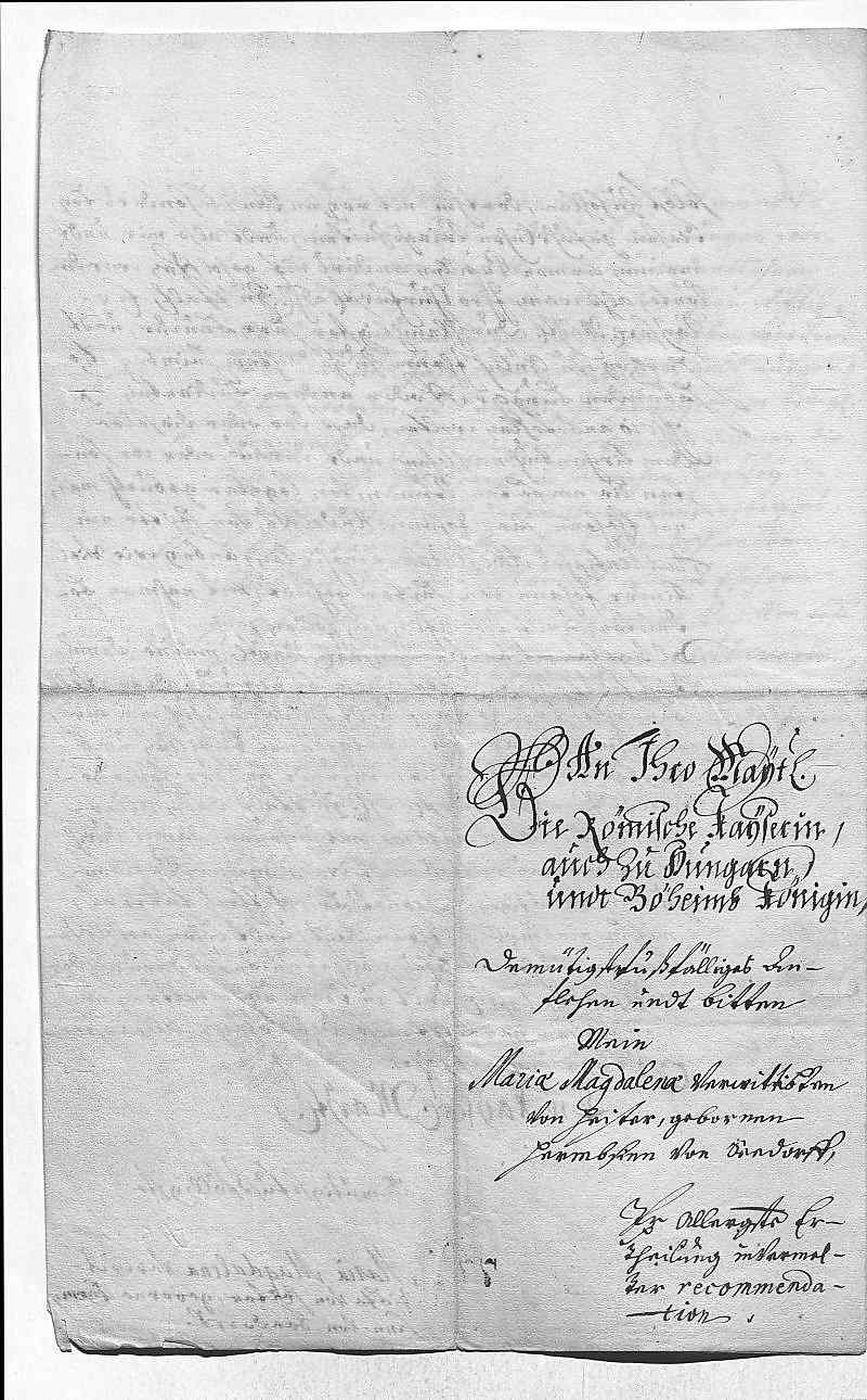 0020kriegs zeit, vnd weilen sie aller mittel entblöset, dort- 0021hin zu raysen nicht vermöge; Alß bäte sie dahin in 0022gnaden verhülfflich zusein, damit dem iezigen Burggraffen 0023zu gedachten Haimbach, oder anderen bedienten, die ex officio nach- 0024suechung in tauffbüechern, vnd einschickhung eine authen- 0025tischen attestati gnedigst aufgetragen werden mögte, 0026allermasßen der beyschluß des mehrern außführet. 0027Welche sobeweglich angesuechte intervention ich vmb 0028soviell weniger verwaigern können, daß wittiben vnd 0029armen wayßen zu dem ihrigen zuhelffen ein gott wolgefälligs 0030werckh, eüer Liebden auch auf selbe iederzeit mit höchstrühmb- 0031lichen schutz vnd protection zureflectiern pflegen; Solchem 0032nach bin ich deß freündtschwesterlichen vnd gnädigsten versehens, eüer 0033Liebden werden der supplicierenden heisterischen wittib, vnd 0034ihren wayßen in gnaden deferieren, vnd verordnen, daß 0035man mit heraußschickhung des vorerwehnten attestati 0036schleünig gratificiere. Übrigens verbleibe deroselben 0037mit freundlicher schwesterlicher affection, vnd genaigten kayserlichem willen 0038iederzeit wolbeygethan. Wienn den 21. julij, anno 16920039eüer Liebden 0040guetwillige vnd getrewe schwester 0041Eleonora Magdalena Theresia