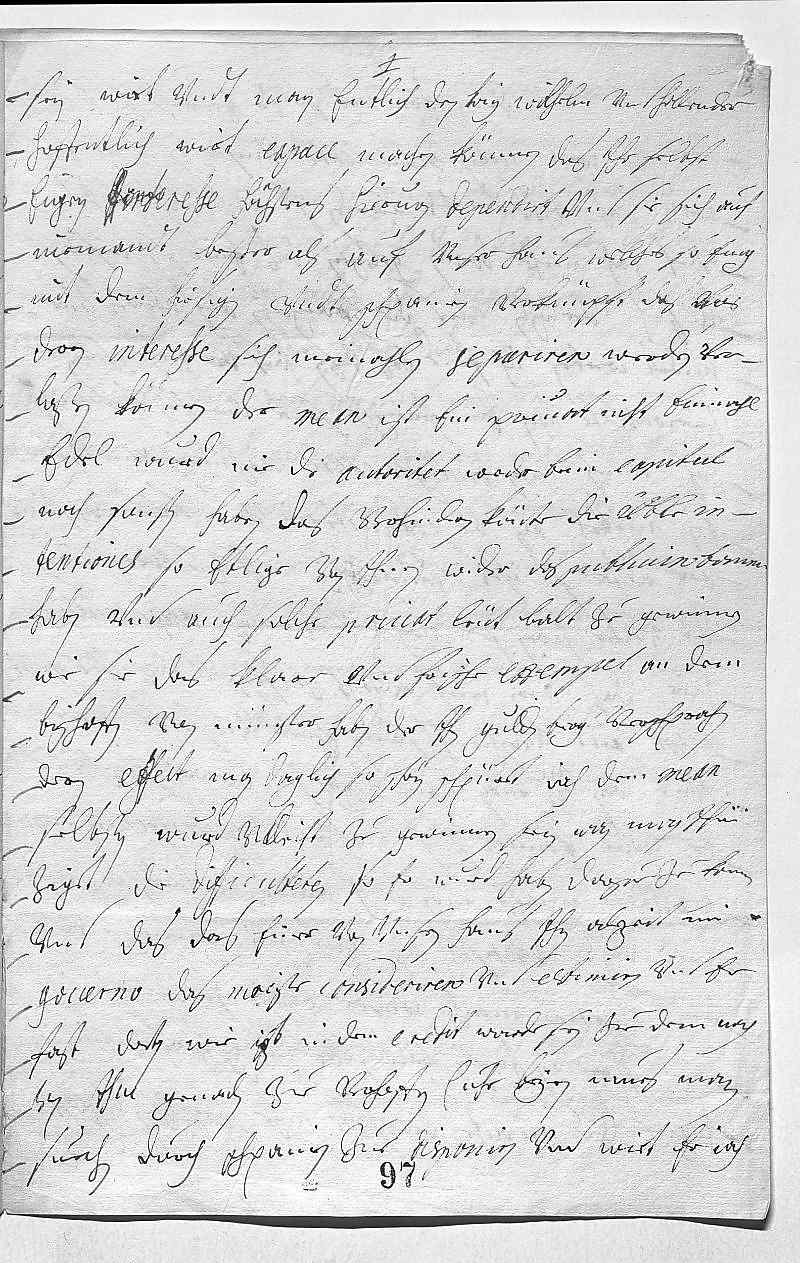 0039sein wirt vndt man entlich den Konig Wilhelm vnd hollender 0040hoffentlich wirt capace machen können, das ihr selbst 0041eigen interesse höchstens hieruon dependirt vnd sie sich auf 0042niemandt beßer als auf vnser haus, welches so enng 0043mit dem hiesigen vndt Schpanien verknüpft, das vns 0044deren interesse sich niemahlen separiren werden, ver- 0045laßen können. Der Mean ist ein priuat, nicht einmahl 0046edel, wurd nie die autoritet weder beim capitul 0047noch sonsten haben, das verhindern könte die üble in- 0048tentiones, so etlige von ihnen wider das publicum bonum 0049haben, vnd auch solche priuat leüt balt zue gewinnen, 0050wie sie das klare vnd frische exempel an dem 0051Bischoffen von Münster haben, der ihnen gulden berg verschprochen, 0052deren effect man daglich so schön schpüret. Iah dem Mean 0053selbsten wurd villeicht zu gewinnen sein, wan man ihm 0054zeiget die difficulteten, so er wurd haben darzue zu komen, 0055vnd das das einer von vnsern haus ihn alzeit im 0056gouerno das maiste consideriren vnd estimirn vnd er 0057fast dorten wie iezt in dem credit wurde sein, zue dem noch 0058von ihr Mayestät genaden zue verhoffen hätte. Cuhr Beyrn mues man 0059suechen durch Schpanien zue disponiren, vnd wirt er iah