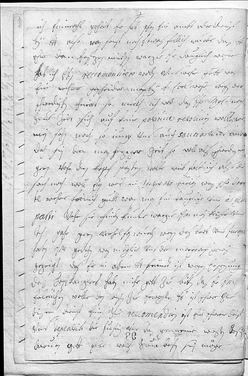 0017so sie verlanget, befohlen zu liuren, als auch die jacht 0018spesen haben übernommen, vnd seindt dero Liebden iezt wider der liebe 0019Hier von da an vohr den Bischof von Preßlaw.0020sohn. Das lüttigische weßen betreffendt, due ich mich vnterstehn, 0021dero Liebden auf dero puncta mein einfaltige meinung 0022zue berichten, dero Liebden wollen mihrs nit übel nemmen vnd 0023mihr nuhr frey widerumb die irige schreiben, aber ich mein, 0024man habe in dißer sach nit vil zeit zue verliren. Erst- 0025lich haben ihr Mayestät schon zue Rohm ein probent vohr den Bischoff 0026von Preßlaw ausgewirkt, dah ich schon die bulla von in handen. 0027Vndt das vnser haus kein vohrtel daruon haben soll, vinde ich 0028nit, dan gesezt, das schon das bischtum vnd Lüttich, welches 0029hoffentlich der liebe gott verhutten wirt, solle in des feindt 0030handen kommen, so wurde es doch durch die fridens 0031tractaten widrumb müeßen restituirt werden, vnd ich ver- 0032meine, es seye dero Liebden vnd vnseres ganzen haus wie auch ihr Mayestät 0033vndt dißem haus höchst dran gelegen, das kein fran- 0034zoß oder franzosische creatur darzue kommen möge. 0035Dises aber kan nit verhindert werden, wan nit, eh der 0036feindt sich mehr dort meister macht, mit einer 0037coadiutoria vohrgesehen wirt, vnd der Mean hatt zue 0038disem kein hoffnung, dan der adel ihm allzeit zuewider