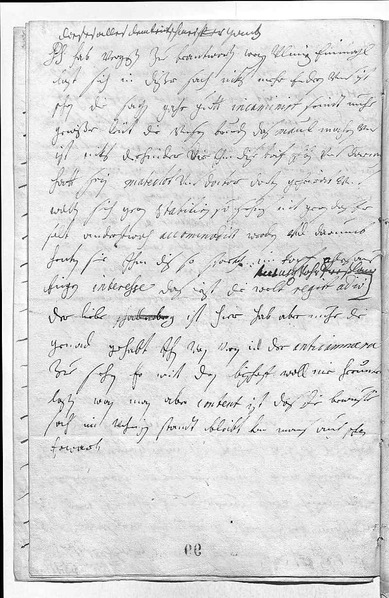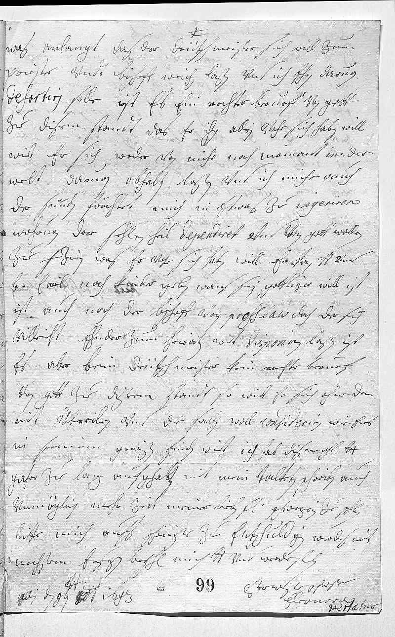 0123Was anlangt das der Deütschmeister sich will zum 0124Priester vndt Bischoff weichen laßen vnd ich ihn daruon 0125dehortirn solle, ist es ein rechter beruef von gott 0126zue disem standt, das er ihn allein vohr sich haben will, 0127wirt er sich weder von mihr noch niemant in der 0128welt daruon obhalten laßen, vnd ich mihr auch 0129der sünden förchtet, mich in etwas zu ingeriren, 0130wohruon der sehlen heil dependiret, vnd von gott wollen 0131zue zien, was er vohr sich haben will. Er kan dero Liebden vnd 0132bruder Carl noch kinder geben, wans sein gottliger will ist, 0133ist auch noch der Bischoff von Presslaw dah, der sich 0134villeicht ehnder zum heiraten wirt disponirn laßen. Ist 0135es aber beim Deütschmeister kein rechte beruef 0136von gott zue dißem standt, so wirt er sich ohne dem 0137nit übereilen vnd die sachen woll considerirn, wie ers 0138in seinem gewißen finden wirt. Ich hab dismahl dero Liebden 0139gahr zue lang aufgehalten mit mein talteten schreiben, auch 0140vmöglich mehr zeit, meiner lieben fraw schwegrin zue schreiben, 0141bitte, mich aufs schönste zu entschuldigen, werds mit 0142nechstem ersezen. Befehl mich dero Liebden vnd werde sterben 0143dero Liebden 0144getrewste schwester 0145Eleonora 0146Wien den 9ten decembris 16930147vertatur