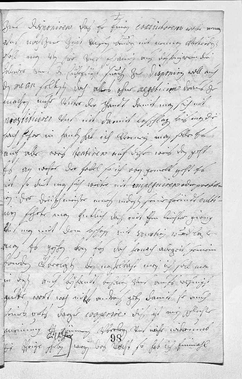 0080zue disponiren, das er einen coadiutorem wolle nemmen, 0081vnd noch zue zeit vnsern brudern nit nennen. Vnterdeßen 0082soll man von hier vndt Schpanien aus den Konig Wilhelm, die 0083hollender vnd den Cuhrfürst suechen zue disponiren, woll auch 0084den Mean selbsten, doch alles ohne negotium draus zu 0085machen, nuhr vnter der handt, damit man sich nit 0086prostituiren, vnd nit darmit losschlagen, bis man die 0087sach sicher in handen hab. Ich vermein, man solle es 0088auf alle weis tentiren auf dise weis, dan geht 0089es an, wehre der fortel, so ich oben gemelt, geht es 0090nit, so dut man sich weiter nit impegniren oder prostitu- 0091irn. Der Deütschmeister mues indeßen seine freündt culti- 0092uiren. Sehete man entlich, das mit ihm leichter gieng 0093vnd man mit dem Bischoff nit spuntirn wurd, laße 0094man es geschen, kan ers doch hernach allezeit seinem 0095bruedren überlaßen. Den Neßelraht, mein ich, soll man 0096in desen auch beyhandt behalten vnd aufs wehnigst 0097guette wort, woh niks anders, geben, damit er auch 0098seines orts darzue cooperire. Dis ist mein schlechte 0099meinung, dero Liebden könnens vberlegen vnd mihr widerumb 0100bis hirher0101die ihrige schreiben. Wegen des Vocht, so hab ich einmahl