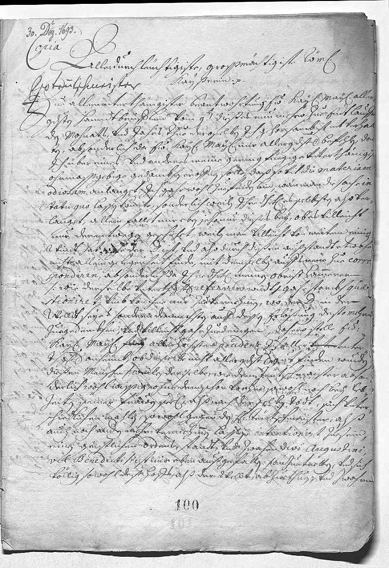 Johann Wilhelm von Pfalz-Neuburg an Eleonora Magdalena von Pfalz-Neuburg, Düsseldorf am 1693.12.30