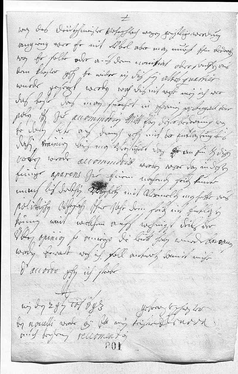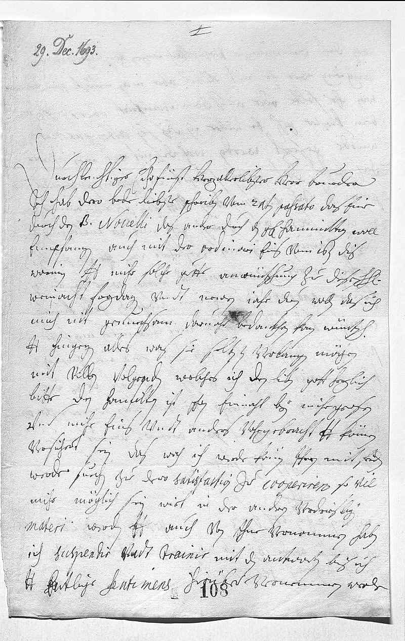 0018Was des Deütschmeister vohrschlach wegen geistlig werdung 0019angieng, wer er nit übel, aber man müest ihm bedrohen, 0020wan er solte oder aus dem nouitiat oder sonsten aus 0021dem kloster gehn, er wider in dis sein altes quartier 0022wurde gesezt werden. Woh dis nit wehr, mein ich, wer 0023das beste, das man suechet in Schpanien, Portugall oder 0024Polen ihn zue accommodiren mitt eben diser bedroung, wan 0025er dorten solte aus diensten gehn, und mit der entlaßung bis 0026dahin trainirn, bis man versichert, das er an ein von disen 0027orten werde accomodirt werden. Were dan in deßen 0028einige aparens zue einem nahenden friden, kunte 0029mans bis dorthin verschieben mit vermelden, man hette aus 0030polittischen vhrsachen ihne vohr dem friden nit entlaßen 0031können. Mit welchem auff wehnigst deils der 0032üblen opinion, so aniezo die leütt haben, wurde benomen0033werden. Erwart, was ich soll antworten, damit mihr 0034d' accordo gehen. Ich sterbe 0035dero Liebden 0036getrewste schwester 0037Eleonora 0038Wien den 29ten decembris 16930039Den Nouelli werde bey ihr Mayestät, mein Keiser, 0040auch bestens reccomendiren.