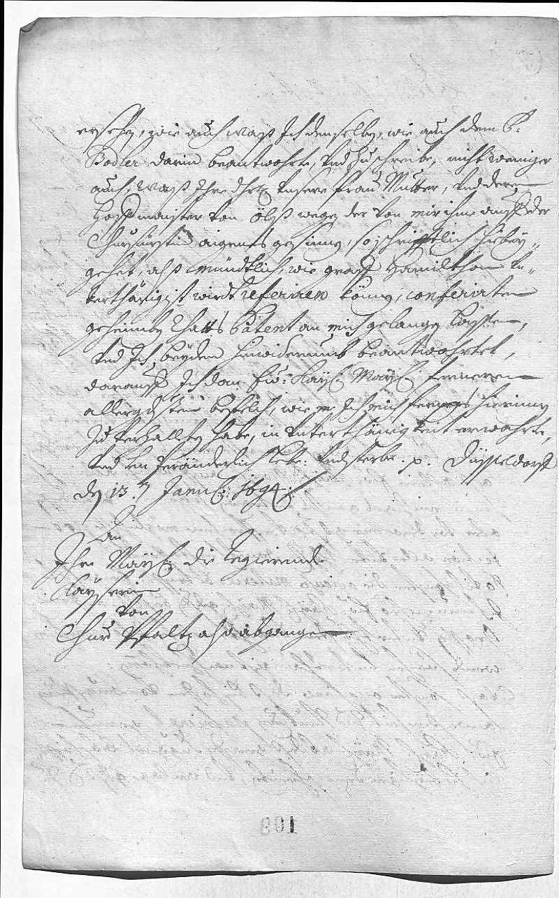 Was die „odiose Materie“ angeht, erwartet JW EMTs weiteren Befehl. – Sendet eine Abschrift des Berichts des Fugger über den Aufenthalt des Bischofs von Augsburg (Bruder Alexander Sigismund) in Neuburg ; ebenso des Briefwechsels zwischen JW, der Mutter und deren Hofmeister von Oels über das von der Mutter verlangte Geheimratspatent.