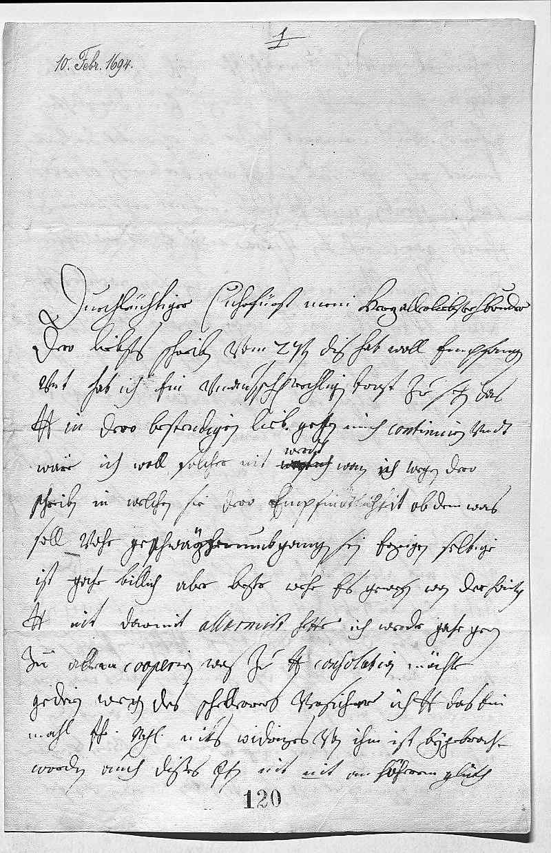 0035bede sich nit saumen sollen, balt dorten zue sein vndt 0036alle andre notwendige anstalt seint dazu gemacht. 0037Heündt ist der freile comedi, so kan nit mehr schreiben, befehl 0038mich dero Liebden vndt sterbe 0039dero Liebden 0040getrewste schwester 0041Eleonora 0042Wien den 11ten februarij 16940043Jezt hab gleich dero Liebden schreiben vom 30ten passato0044bekommen, darauf auch dises obige zue antwort dient.