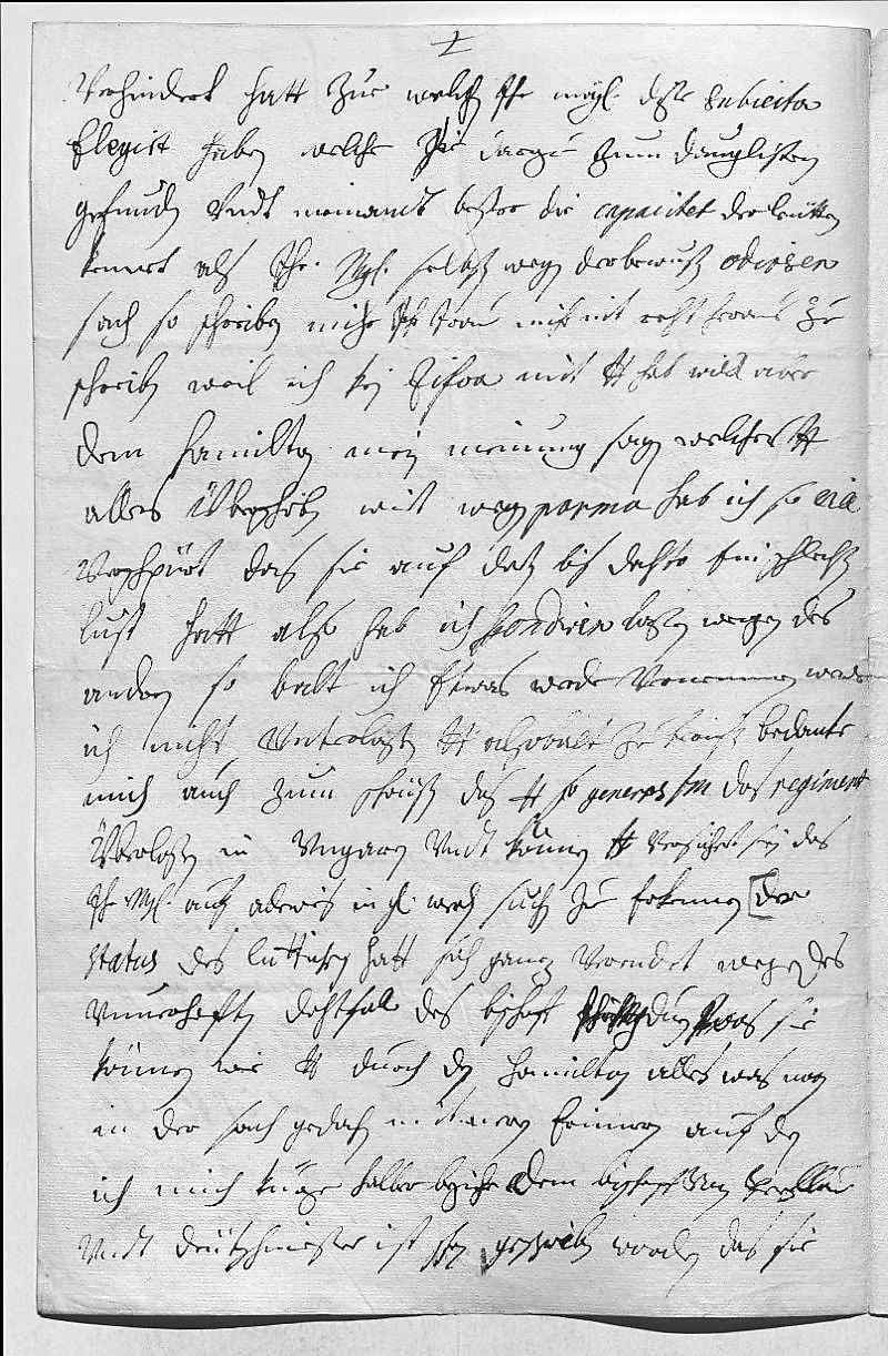 0001Durchleüchtiger Cuhrfürst, mein herzallerliebster herr bruder 0002Dero liebsts schreiben vom 27ten dis hab woll empfangen, 0003vndt hab ich ein vnausschprechligen trost zue sehen, das 0004dero Liebden in dero bestendigen lieb gegen mich continuiren. Vndt 0005wäre ich woll solcher nit wersich werdt, wan ich wegen dero 0006schreiben, in welchen sie dero empfindtlichkeit ob dem, was 0007soll vohr geschwäz herumb gangen sein, erzeigen verwundert wäre. Selbige 0008ist gahr billich, aber beßer wehr es gewesen, wan der Hamilton 0009dero Liebden nit darmit allarmirt hette. Ich werde gahr gern 0010zu allem cooperiren, was zu dero Liebden consolation möchte 0011gedeien. Wegen des Schellerers versicher ich dero Liebden, das ein 0012mahl ihr Mayestät niks widriges von ihm ist beygebracht 0013worden, auch dißes ihn nit nit an höherem glükh