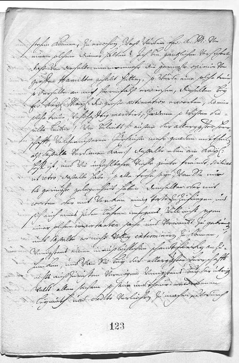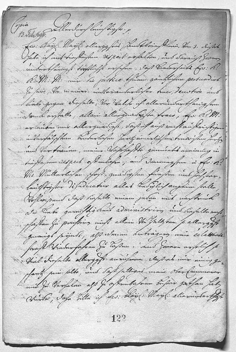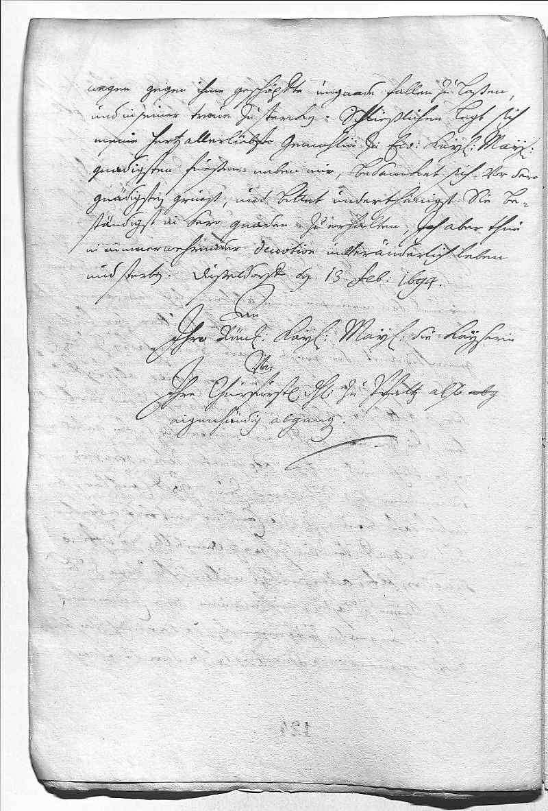 Widerspricht EMTs Meinung, es habe sich (bei den Gerüchten um angebliche Verhandlungen JWs mit Frankreich ) nur um leeres Geschwätz gehandelt, von dem sein Oberkämmerer (Hamilton) JW besser gar nicht berichtet hätte. Vielmehr war es dessen Pflicht, JW so gefährliche Gerüchte, die den Feinden seines Hauses in die Hände spielen, zu melden. Zwar stimmt es, dass hohe Herren Gerüchten unterworfen sind, doch bleiben diese sonst meist geheim. Bittet daher nochmals um Bestrafung der Verleumder und um eine öffentliche Klarstellung durch Bestellung des Schellerer zum Hofkanzler, besonders, falls der Reichsvizekanzler sterben und Graf Windischgrätz ihm nachfolgen sollte. – Bittet, dass EMT seinem Obristkämmerer gewogen bleibt. – JWs Gemahlin bedankt sich für die Grüße.