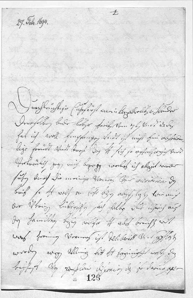 0050ein große genad vndt billich gedahn, die dochter bey 0051dero fraw gemahlin anzuenemmen. Das medel ist aber noch 0052klein, kleber vndt der elteren ihr augapfel, wirt 0053sie hart ankommen, sie so weit von sich zue laßen. 0054Ich vermeinte vnmasgeblich, es were beßer, wan 0055man kundt machen, das die sachen zue Neüburg in 0056der bedienung widerumb in vohrigen standt kemen. 0057Vndt glaubte auch, man soll dem gutten Pater Bodler 0058in keiner materi, die ihr Durchlaucht nit gahr angenem, 0059nit vill comission geben, sonst möcht er auch 0060cassirt werden, vndt das wehre das allerschlimste, das 0061geschen kunte, den müeßen mihr suchen wider in gnaden 0062zue bringen, wans möglich sein wirt, so wirt das 0063das einzige mittel sein, dem Bischoff das contrapeso 0064zue halten. Mit disem, mein ich, solten sich dero Liebden nit zue 0065verstehen geben, wurd nuhr mißvergnüegung vnd 0066doch kein endrung veruhrsachen. L' e cossi fatto, dort 0067mus man sehn, auf andre weis zue helfen, colle cattiue 0068richten mihr niks. Ich schlies vnd sterb 0069dero Liebden getrewste schwester 0070Eleonora 0071Wien den 27ten jener 16940072Bitt mein entschuldigung an mein fraw schwegrin zu sagen, mit nechsten 0073werde ersezen, heüt ists vnmüglich. 0074Weil dis ein original, so schik es wider zuruckh.