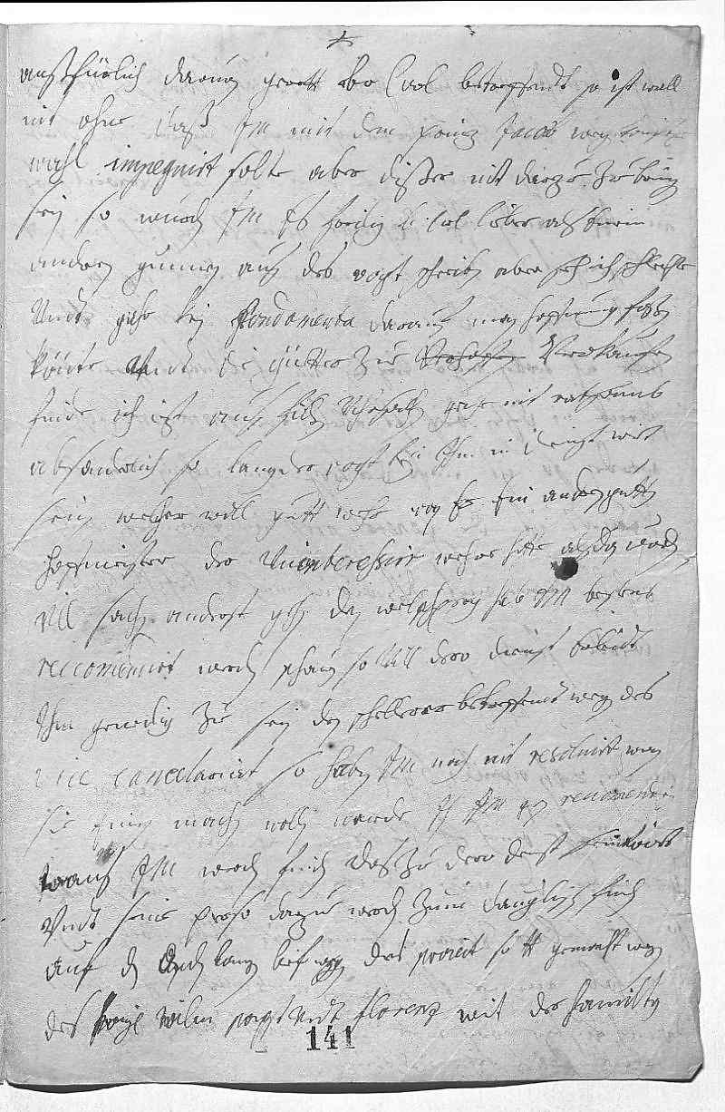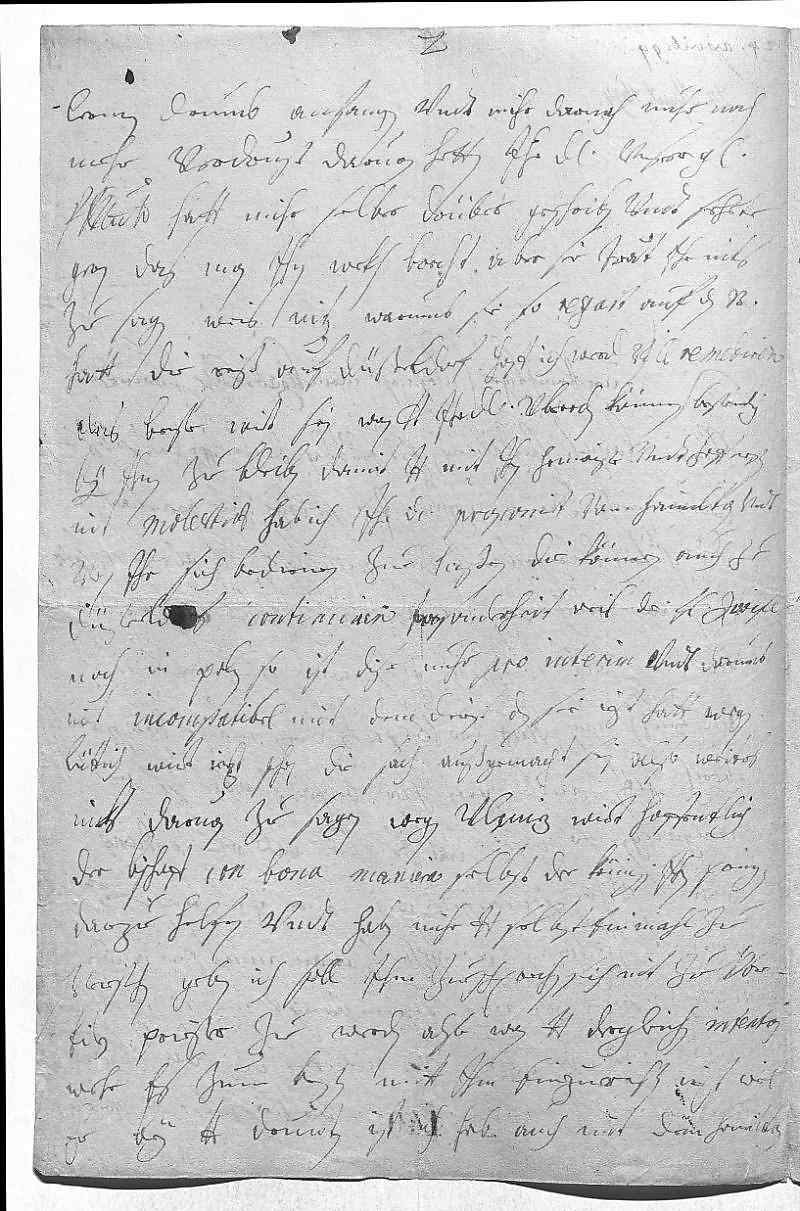 0016lermen drumb anfangen vndt mihr darnach nuhr noch 0017mehr verdruß daruon hetten. Ihr Durchlaucht, vnser geliebste 0018fraw muter, hatt mihr selber drüber geschriben vndt sehete 0019gern, das man ihn wekh brecht, aber sie traut ihr niks 0020zue sagen, weis nit, warumb sie so regart auf den Bischof 0021hatt. Die reiß auf Düßeldorf, hoff ich, werd vill remediren, 0022das beste wirt sein, wan dero Liebden ihr Durchlaucht vbereden können, bestendig 0023bey ihnen zue bleiben. Damit dero Liebden mit ihren Hofmaister vndt Hoffmeisterin 0024nit molestirt, hab ich ihr Durchlaucht proponirt, vom Hamilton vndt 0025von ihr sich bedienen zue laßen, die können auch zue 0026Düßeldorf continuiren, insonderheit weil die fraw Zwifl 0027noch in Polen, so ist dise nuhr pro interim vndt darumb 0028nit incompatibel mit dem dienst, den sie iezt hatt. Wegen 0029Lüttich wirt iezt schon die sach außgemacht sein, also weiters 0030niks daruon zue sagen. Wegen Vlmiz wirt hoffentlich 0031der Bischoff con bona maniera selbst der Königin ihren Prinzen 0032darzue helfen, vndt haben mihr dero Liebden selbst einmahl zue 0033verstehn geben, ich soll ihm zueschprechen, sich nit zue vber- 0034eilen priester zue werden, also wan dero Liebden noch dergleichen intention, 0035wehr es zum besten mitt ihm einzuerichten iezt, weil 0036er bey dero Liebden drunten ist. Ich hab auch mit dem Hamilton