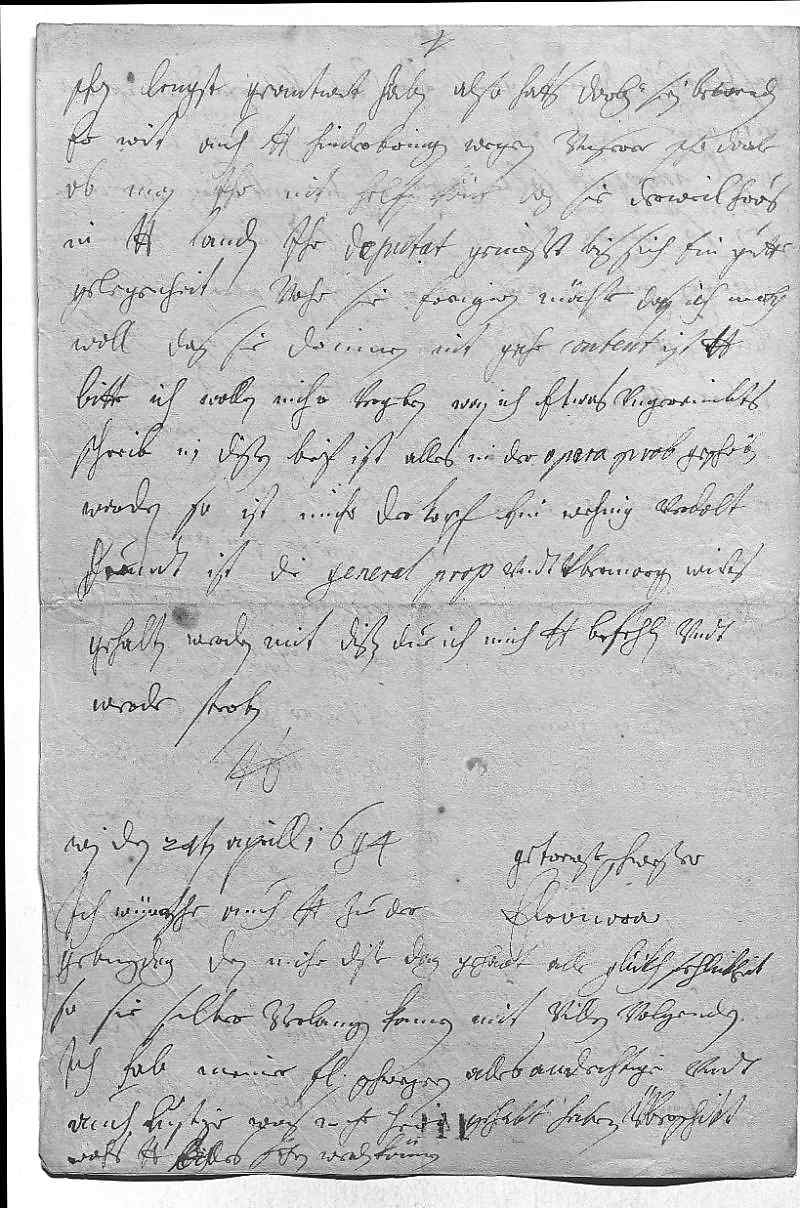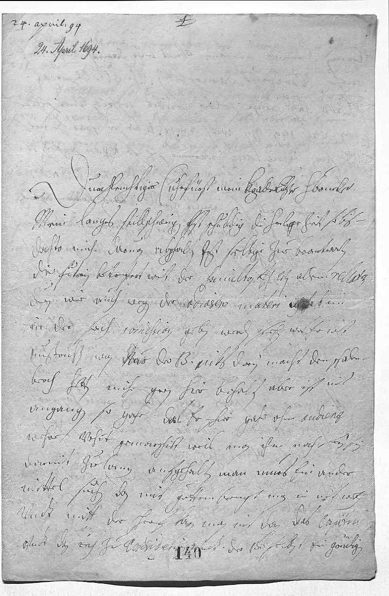 0057schon lengst geantwort haben, also hats darbey sein bewenden. 0058Er wirt auch dero Liebden hinderbringen wegen vnserer schwester Dorote, 0059ob man ihr nit helfen könt, das sie derweil heraus 0060in dero Liebden landen ihr deputat genießet, bis sich ein gutte 0061gelegenheit vohr sie ereignen möchte, dan ich merkh 0062woll, das sie drinnen nit gahr content ist. Dero Liebden 0063bitte ich, wollen mihr vergeben, wan ich etwas vngereimbts 0064schreib in dißen brif, ist alles in der opera prob geschriben 0065worden, so ist mihr der kopf ein wehnig verdolt. 0066Heündt ist die general prop, vndt vbermorgen wirts 0067gehalten werden. Mit disen due ich mich dero Liebden befehlen vndt 0068werde sterben 0069dero Liebden 0070getrewste schwester 0071Eleonora 0072Wien den 24ten aprill 16940073Ich wüntsche auch dero Liebden zu der 0074geburzdag, den mihr dise dag gehabt, alle glükh sehlickheit, 0075so sie selber verlangen konnen mit villen volgenden. 0076Ich hab meiner fraw schwegerin alles andechtige vndt 0077auch lustige, was mihr herin gehabt haben, überschikt, 0078wohs dero Liebden alles sehen werden können.