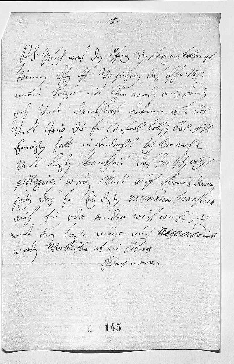 0026Postscriptum Auch was den Prinz von Saxen belangt, 0027können ihn dero Liebden versicheren, das ihr Mayestät, 0028mein Keiser, nit ihm werden aus handen 0029gehn vndt dankhbahr erkennen alle lieb 0030vndt trew, die er vnseren liebsten bruder sehlig 0031erwißen hatt, in sonderheit bey der wahl 0032vndt lezten krankheit, so das ihr Mayestät ihn alzeit 0033protegiren werden vndt auf alleweis daran 0034sey, das er bey dißen vacirenden beneficis 0035auf ein oder andere weis, wie es sich 0036wirt duen laßen, möge auch accomodirt 0037werden. Verbleibe vt in literis 0038Eleonora