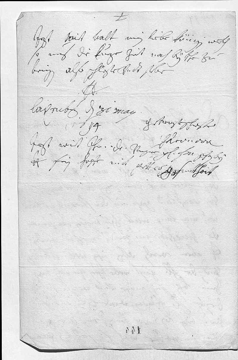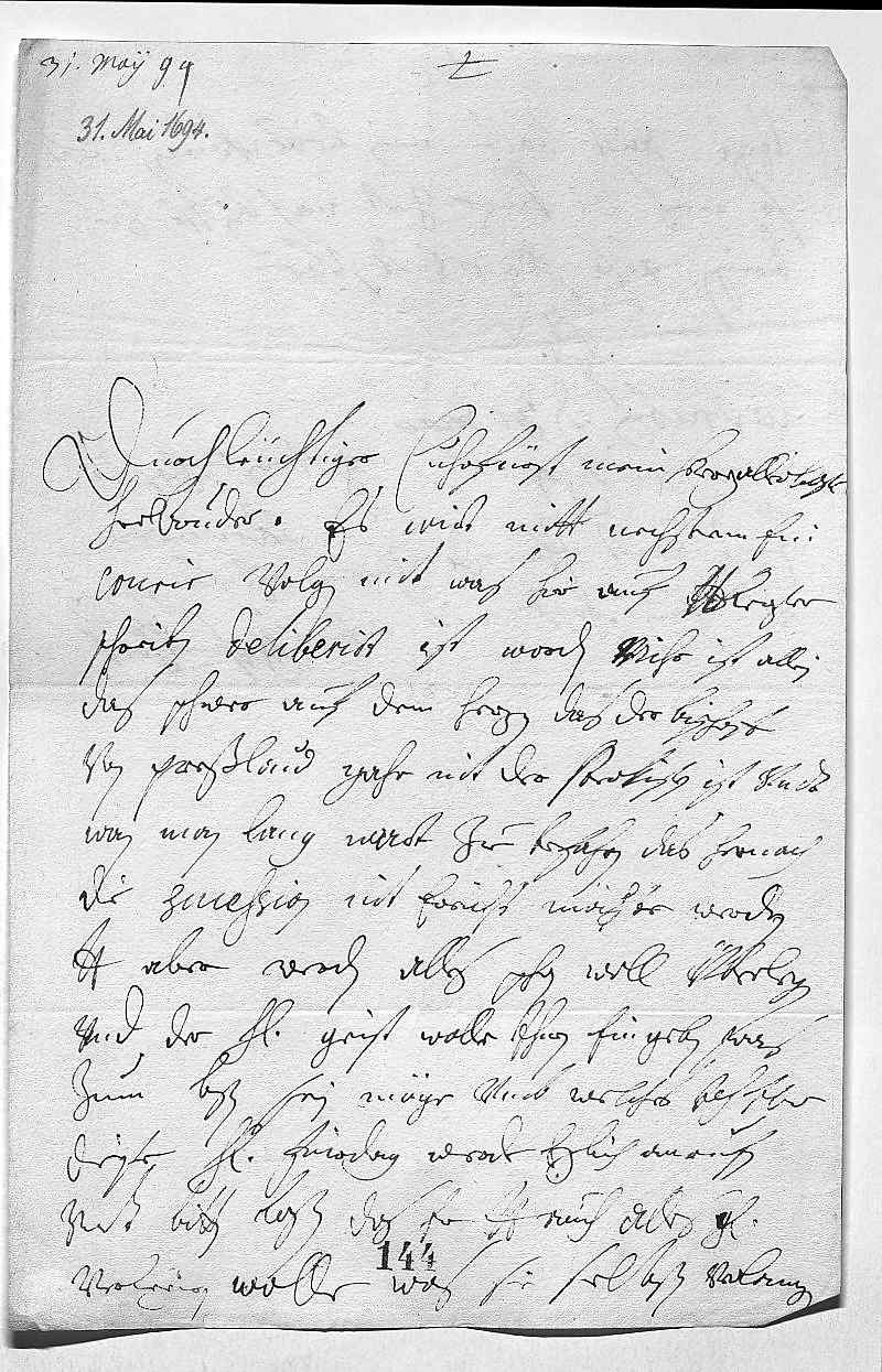000131. maij 940002Durchleüchtiger Cuhrfürst, mein herzallerlibster 0003her bruder. Es wirt mitt nechstem ein 0004courir volgen mit was hier auf dero Liebden lezter 0005schreiben deliberirt ist worden. Mihr ist allein 0006das schwer auf dem herzen, das der Bischoff 0007von Preßlaw gahr nit der sterkisten einer ist, vndt 0008wan man lang wart zue befahren, das hernach 0009die sucession nit ereicht möchte werden. 0010Dero Liebden aber werden alles schon woll überlegen, 0011vnd der heilige geist wolle ihnen ein geben, was 0012zum besten sein möge, vmb welches ich ihne 0013diese heilige feirdag werde ezlich anrufen 0014vndt bitten laßen, das er dero Liebden auch alles gnädig 0015verleyen wolle, was sie selbsten verlangen.
