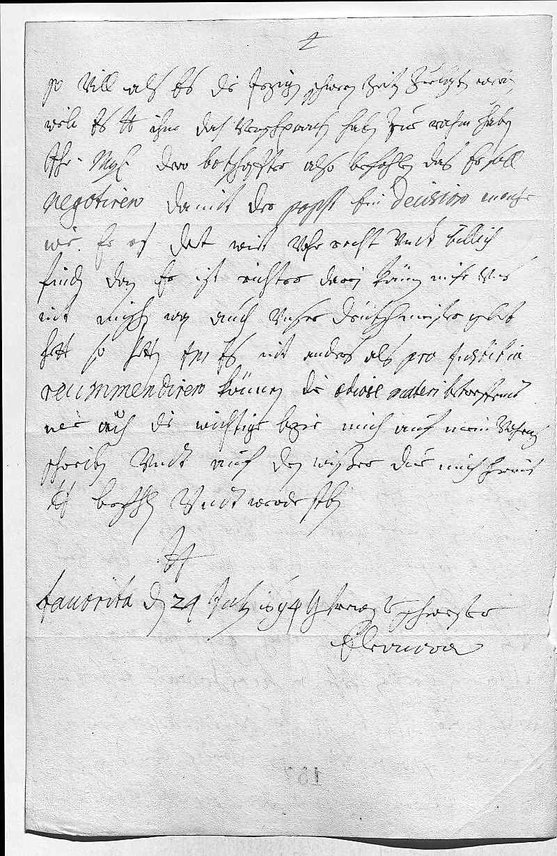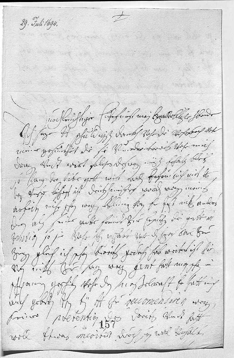 0016so vill als es die iezigen schweren zeiten zuelaßen werden. 0017Weill es dero Liebden ihm dah verschprochen haben zue Rohm, haben 0018ihr Mayestät dero Botschaffter also befohlen, das er soll 0019negotiren, damit der Papst ein decision mache, 0020wie er es dort wirt vohr recht vndt billich 0021finden, dan er ist richter, darein können mihr vns 0022nit mischen, wan auch vnser Deütschmeister gelebt 0023hett, so hetten ihr Mayestät es nit anders als pro iustitia 0024recommendiren können. Die odiose materi betreffendt 0025wie auch die wichtige, bezie mich auf mein vohrigs 0026schreiben vndt auf den Wißer . Due mich hirmit 0027dero Liebden befehlen vndt werde sterben 0028dero Liebden 0029getrewste schwester 0030Eleonora 0031Fauorita den 24en julij 1694