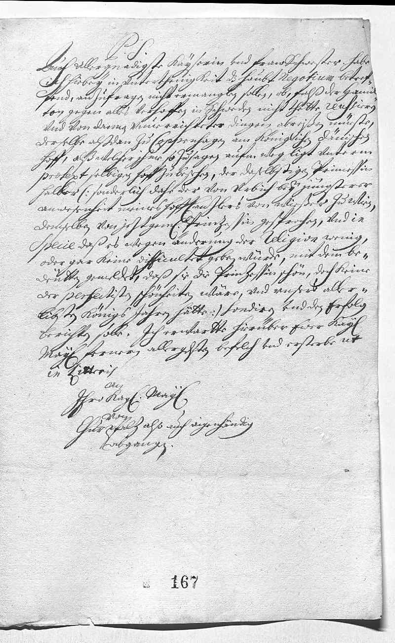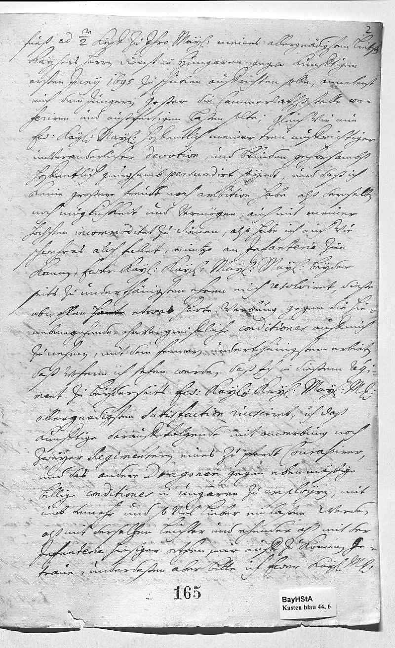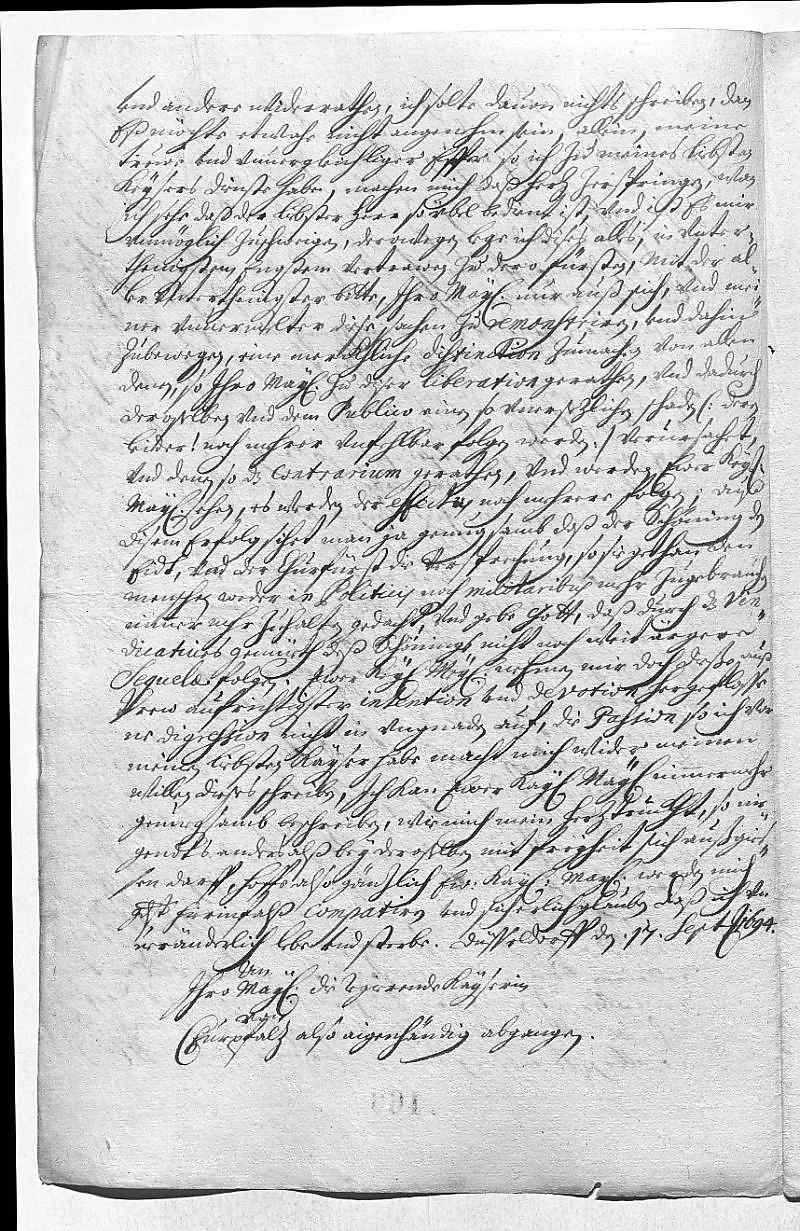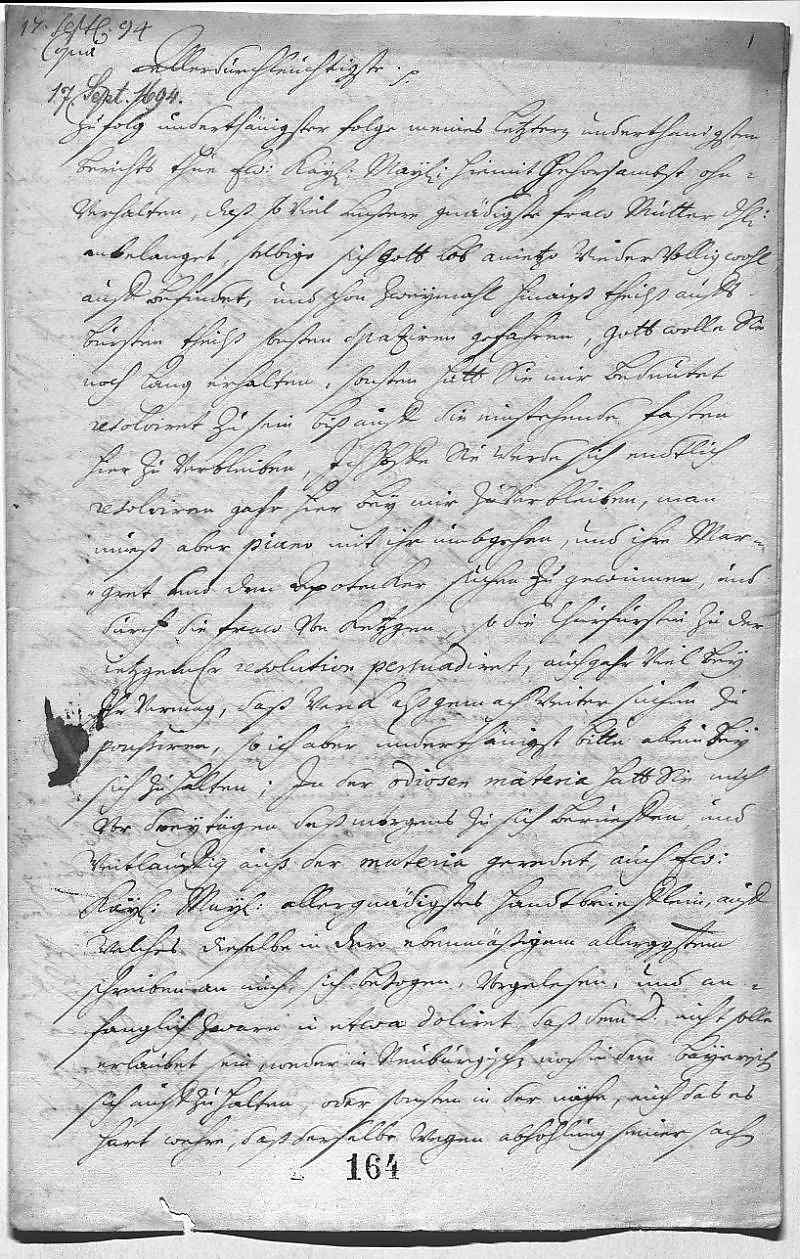 Die Mutter will bis zur nächsten Fastenzeit bei JW bleiben und wird hoffentlich noch zu überreden sein, ganz zu bleiben. – In der „odiosen Materie“ hat sie den Revers, den der D. (Doktor Schweizer) unterschreiben und beschwören soll, sehr hart gefunden; ebenso, dass er sich aus Neuburg und Bayern fernhalten soll. Sie ist aber nun einverstanden und wird auch dem „wunderlichen“ Bischof von Augsburg (Bruder Alexander Sigismund) nachdrücklich schreiben. – Sein Hofkanzler Wiser hat in EMTs Namen berichtet, dass JW bis zum 1. Juni 1695 ein Infanterieregiment von 2.000 Mann für die kaiserliche Armee in Ungarn anwerben soll. So schwer dies fallen wird, sagt JW es gerne zu und könnte zu denselben Konditionen zusätzlich zwei berittene Regimenter stellen. – Hat dem Gesser ein Kammerratspatent ausgestellt. – Die Hauptsache (gemeint sind die Heiratsverhandlungen für König Joseph I. mit Schweden) betreffend, wird er seinen Obristkämmerer in wenigen Tagen losschicken. Fragt, ob dieser, falls die Verhandlungen in Schweden misslingen sollten, auf der Heimreise in Dänemark sondieren soll. Empfiehlt den Rummel und Fürst Salm als treue, ganz von EMT abhängige Vertrauenspersonen im Umfeld von König Joseph I. – Bittet nochmals, der Frau des Reichsvizekanzlers Graf Windischgrätz ständigen Zutritt zum Frauenzimmer EMTs zu gewähren. – Will für das Fräulein von Herberstein nach Köln und Mainz schreiben. – Dass die kursächsischen Truppen den Markgrafen Ludwig von Baden so plötzlich verlassen haben, als er den Rhein passieren wollte, ist auf die Freilassung des Schöning zurückzuführen; man kann nur hoffen, dass nicht noch Schlimmeres daraus folgt.