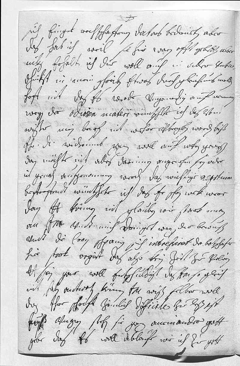 0001Durchleüchtiger Cuhrfürst, mein herzallerlibster herr bruder 0002Ich hab dero liebsts schreiben vom 12ten dis woll empfangen. 0003Hab dero vohrigen brief nit recht geleßen vndt verstanden 0004gehabt, das mein fraw schwegerin ein wehnig ein colica hab, 0005so hab ich gemeint, wert etwan ein gutte bedeütung 0006haben vndt balt wider vergehn, wan ichs aberrecht 0007gelesen, wehr ich in vnerhörten ängsten geweßen. Dißer lezte 0008brif hatt mich widerumb getröst, weils wider 0009beßer ist vndt nuhr ein cattarr ist draus worden, 0010der, hoffe ich, werde izt auch balt wider vergehn. 0011Mueß aber bekennen, das ich noch nit gahr 0012außer sorgen bin, biß ich könftige post die 0013vollige gesuntheit ihr Durchlaucht vernemmen 0014werde. Freilich wehre zue wüntschen, das ihr Durchlaucht