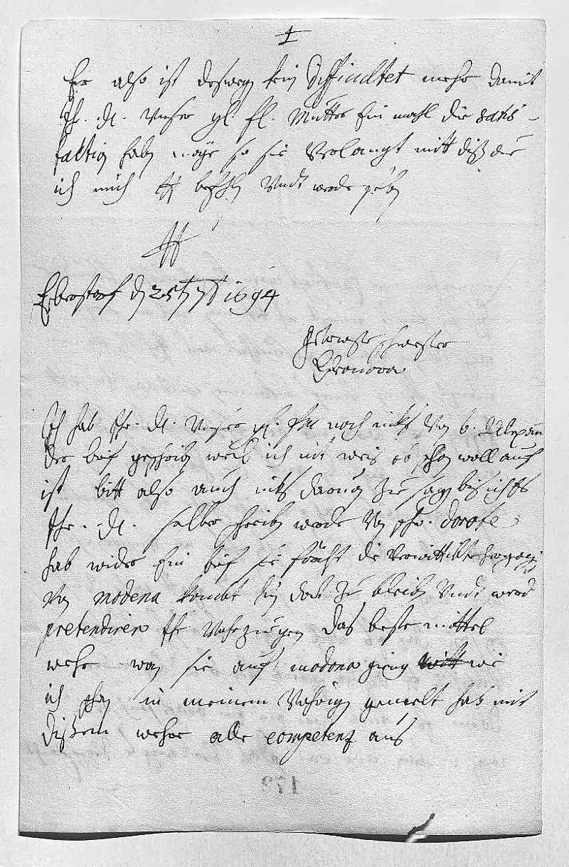 0014er also ist deswegen kein difficultet mehr, damit 0015ihr Durchlaucht, vnser geliebste fraw mutter, ein mahl die satis- 0016faction haben möge, so sie verlangt. Mit disen due 0017ich mich dero Liebden befehlen vndt werde sterben 0018dero Liebden 0019getrewste schwester 0020Eleonora 0021Eberstorf den 25ten septembris 16940022Ich hab ihr Durchlaucht, vnser geliebsten fraw mutter, noch niks von bruder Alexan- 0023der brif geschriben, weil ich nit weis, ob sie schon woll auf 0024ist. Bitt also, auch niks daruon zue sagen, bis ich es 0025ihr Durchlaucht selber schreiben werde. Von schwester Dorote 0026hab wider ein brif, sie förcht, die verwittibte Herzogin 0027von Modena kombt, vm dort zu bleiben, vndt werd 0028pretendiren ihr vohrzuegen. Das beste mittel 0029wehr, wan sie auf Modona gieng, witt wie 0030ich schon in meinem vohrigen gemelt hab, mit 0031dißem wehre alle competenz aus.