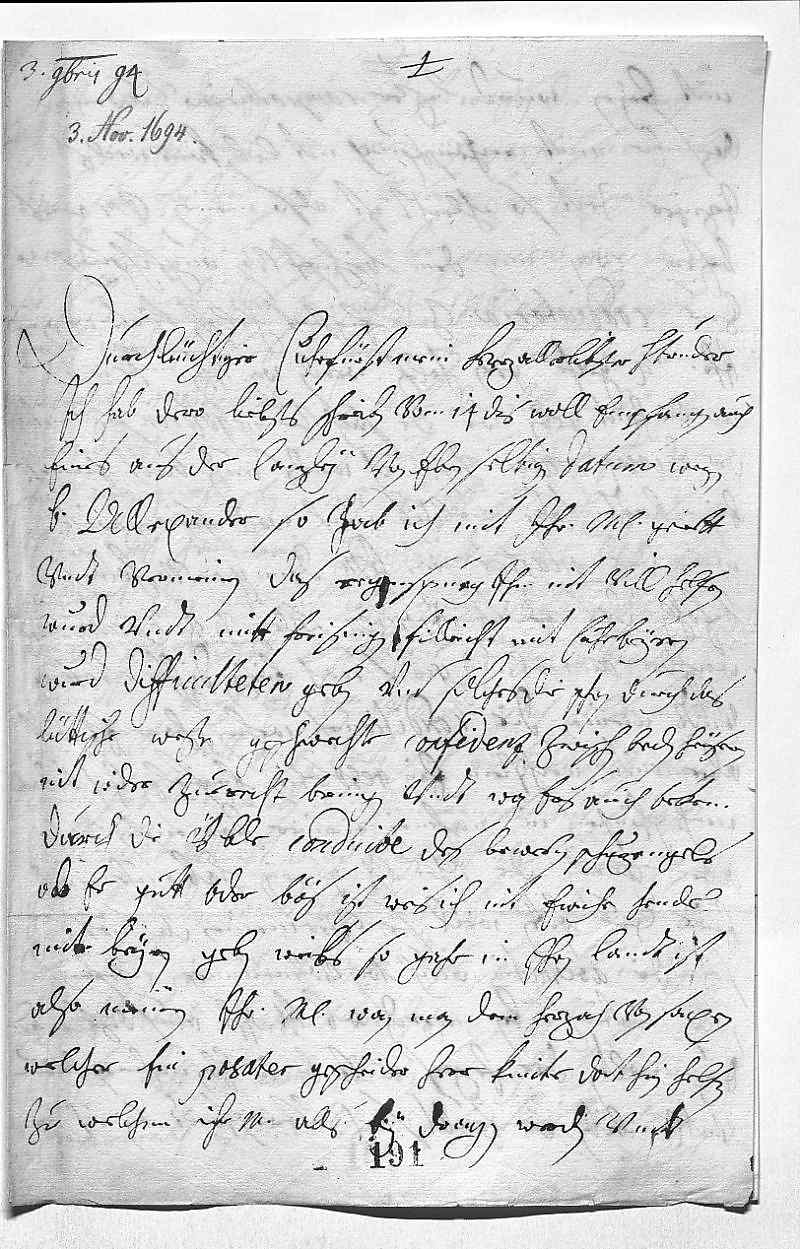 00013. novembris 940002Durchleüchtiger Cuhrfürst, mein herzallerlibster herr bruder 0003Ich hab dero liebsts schreiben vom 14ten dis woll empfangen, auch 0004eines aus der canzley von eben selbigen datum. Wegen 0005bruder Allexander, so hab ich mit ihr Mayestät gerett 0006vndt vermeinen, das Regenspurg ihm nit vill helfen 0007wurd vndt mitt Freisingen filleicht mit Cuhrbeyren 0008wurd difficulteten geben vnd solches die schon durch das 0009lüttische weßen geschwechte confidenz zwischen beden heüsern 0010nit wider zuerecht bringen ließe vndt wan ers auch bekem, 0011durch die üble conduite des bewerten schuzengels, 0012ob er gutt oder bös ist, weis ich nit, würde es ewiche hendel 0013mit Beyrn geben, weils so gahr in ihren landt ist. 0014Also meinen ihr Mayestät, wan man dem Herzoch von Saxen, 0015welcher ein posater gescheider herr, künte dort hin helfen, 0016zu welchem ihr Mayestät alls bey dragen werden, vndt