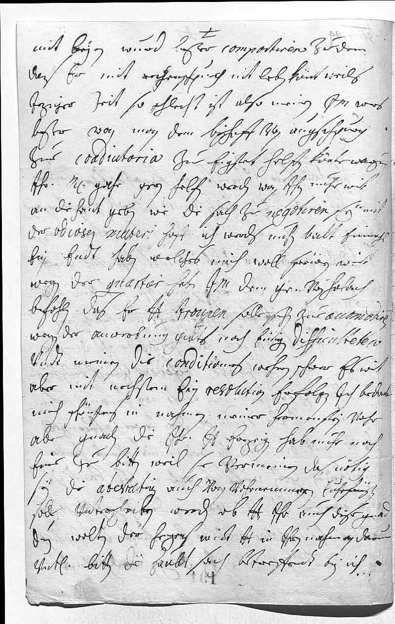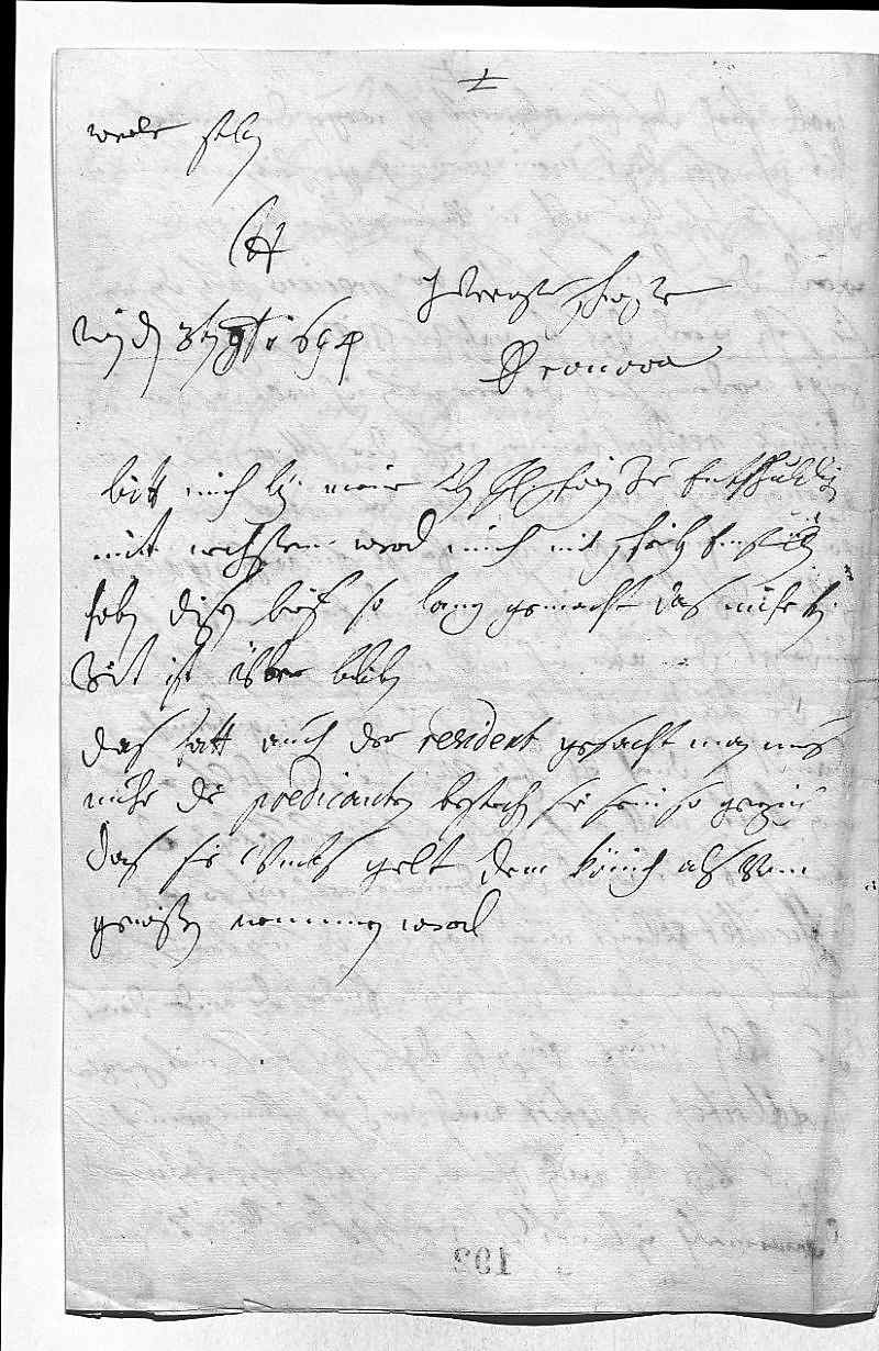 0017mit Beyrn wurd beßer comportiren zue dem, 0018das er mit Rechenschpurch nit leben könt, weils 0019jeziger zeit so schlecht ist. Also, meinen ihr Mayestät, wers 0020beßer, wan man dem Bischoff von Augschpurg 0021zur coadiutoria zue Eigstet helfen könte, warzu 0022ihr Mayestät gahr gern helfen werden, wan ihnen nuhr wirt 0023an die hant geben, wie die sach zu negotiren sey. Mit 0024der odiosen materi, hoff ich, werds nuhn balt einmahl 0025ein endt haben, welches mich woll frewen wirt. 0026Wegen der quartier haben ihr Mayestät dem Graven von Holach 0027befohlen, das er dero Liebden troupen solle sehn zue accomodiren. 0028Wegen der anwerbung gibts noch einigen difficulteten, 0029vndt meinen, die conditiones wehren schwer, es wirt 0030aber mit nechstem ein resolution erfolgen. Ich bedank 0031mich schönstens in nahmen meiner Hermenstein vohr 0032alle gnaden, die ihr dero Liebden erzeigen, hab nuhr noch 0033eine zue bitten, weil sie vermeinen, das nötig 0034sey die atestation auch von vohrnemmern Cuhrfürsten 0035solle vnterschriben werden, ob dero Liebden ihr auch diese gnad 0036dun wolten, der Hezers wirt dero Liebden in ihren nahmen darum 0037vnterdehnigst bitten. Die haubt sach betreffendt bin ich