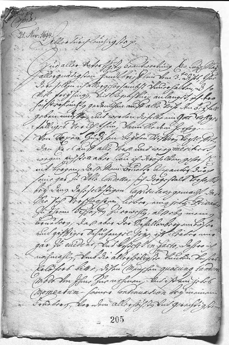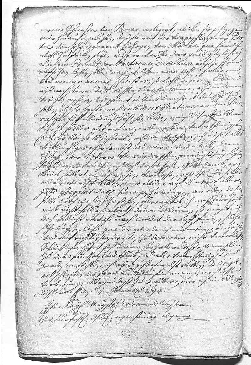Stimmt zu, dass EMT den Herzog von Sachsen(-Zeitz) bei seiner Bewerbung um die Bistümer Freising und Regensburg unterstützt. – Bruder Alexander hat sich in Eichstätt zu verhasst gemacht, um gewählt zu werden; der Schallenberg sollte dringend aus seiner Nähe entfernt werden. – Die „odiose Materie“ wird demnächst ein Ende finden, da der Dr. (Doktor Schweizer) nun den ihm vorgelegten Revers unterschreiben und beschwören will. – Dankt für den kaiserlichen Befehl bezüglich der Quartiere für seine Truppen und bittet angesichts seines selbstlosen Einsatzes im Reichskrieg um Unterstützung gegenüber unwilligen kaiserlichen Amtsträgern. – Bittet bezüglich des oberrheinischen Reichskreises um kaiserliche Intervention bei Graf Kinsky, der in allem gegen JW arbeitet, und beim (Hoch- und) Deutschmeister (Bruder Franz Ludwig). – Entschuldigt sich, dass es für die Werbung eines neuen Regiments zu spät ist. – Hat das Attest des Fräuleins von Herberstein sofort unterschrieben und weitergeleitet. – JW und die Mutter bitten um ein Regiment für Landgraf Philipp von Hessen-Darmstadt, der auf Grund seiner Konversion sein holländisches Regiment verloren hat. – Berichtet im Vertrauen über Anzeichen, dass England und Holland heimlich mit Frankreich über einen Separatfrieden verhandeln könnten; sendet hierzu eine Abhandlung. – Berichtet zu den Eheverhandlungen für König Joseph I., dass Graf Hamilton inzwischen in Stockholm sein dürfte; nimmt zur Kenntnis, dass EMT der dänischen Prinzessin abgeneigt ist. – Warnt davor, den noch vom Vater als Erzieher Josephs empfohlenen Rummel zu entlassen und empfiehlt ihn nachdrücklich wegen seiner Treue zum Haus Pfalz-Neuburg . – Seine Schwester (Dorothea Sophie, verwitwete Herzogin) von Parma hat JW ihre Zustimmung zu einer Ehe mit dem regierenden Herzog (Rinaldo d’Este) von Modena mitgeteilt; JW fragt, ob er einen Ehekontrakt vorbereiten soll. – Dankt für die zugesagten Subsidien, wenn er auch dieses Jahr noch nichts davon erhalten hat, und bittet um neuerliche Anweisung.