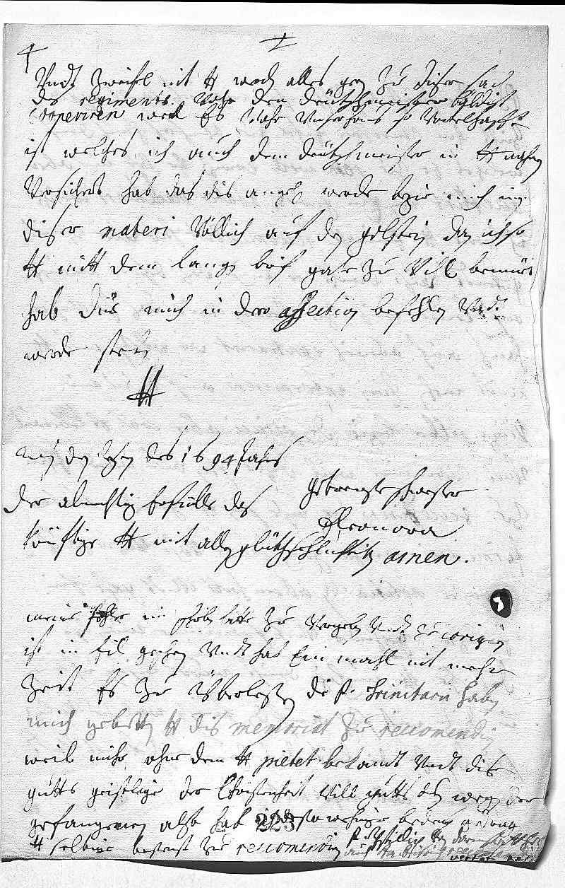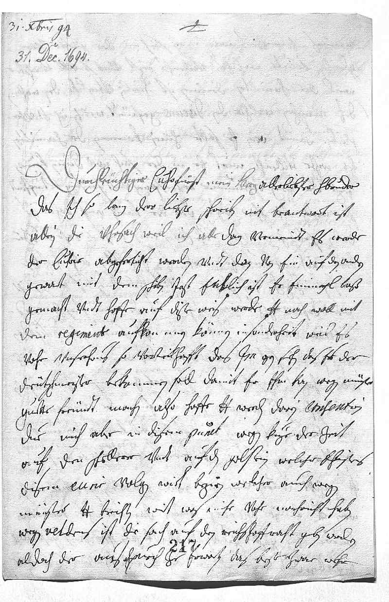 0268vndt zweifel nit, dero Liebden werden alles gern zue diser sach 0269des regiments vohr den Deütschmeister baldist 0270cooperiren, weil es vohr vnser haus so vortelhafft 0271ist, welches ich auch dem Deütschmeister in dero Liebden nahmen 0272versichert hab, das dis angehn werde. Bezie mich inn 0273diser materi völlich auf den Golstein, dan ich so 0274dero Liebden mitt dem langen brif gahr zue vil bemüet 0275hab. Due mich in dero affection befehlen vndt 0276werde sterben 0277dero Liebden 0278getrewste schwester 0279Eleonora 0280Wien den lezten des 1694 iahrs0281Der almechtig erfülle das 0282könftige jahr dero Liebden mit allen glükhsehlichkeiten, amen 0283Meine fehler im schreiben bitte zue vergeben vndt zue corigiren, 0284ist in eil geschen vndt hab ein mahl nit mehr 0285zeit, es zue überleßen. Die patres trinitarii haben 0286mich gebetten, dero Liebden dis memorial zue reccomendiren. 0287Weil mihr ohne dem dero Liebden pietet bekandt vndt dise 0288gutte geistlige der christenheit vill gutts duen wegen der 0289gefangenen, also hab ich desto wehniger bedenken gedragen, 0290dero Liebden selbige bestens zue reccomendiren. 0291Fetter Pfilip von Darmstatt hab 0292auch ihr Mayestät eifrich reccomendirt 0293vertatur