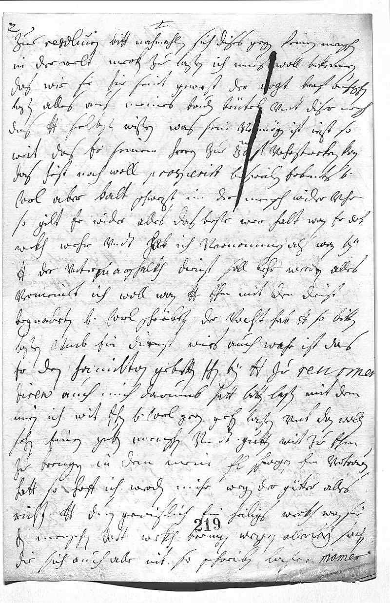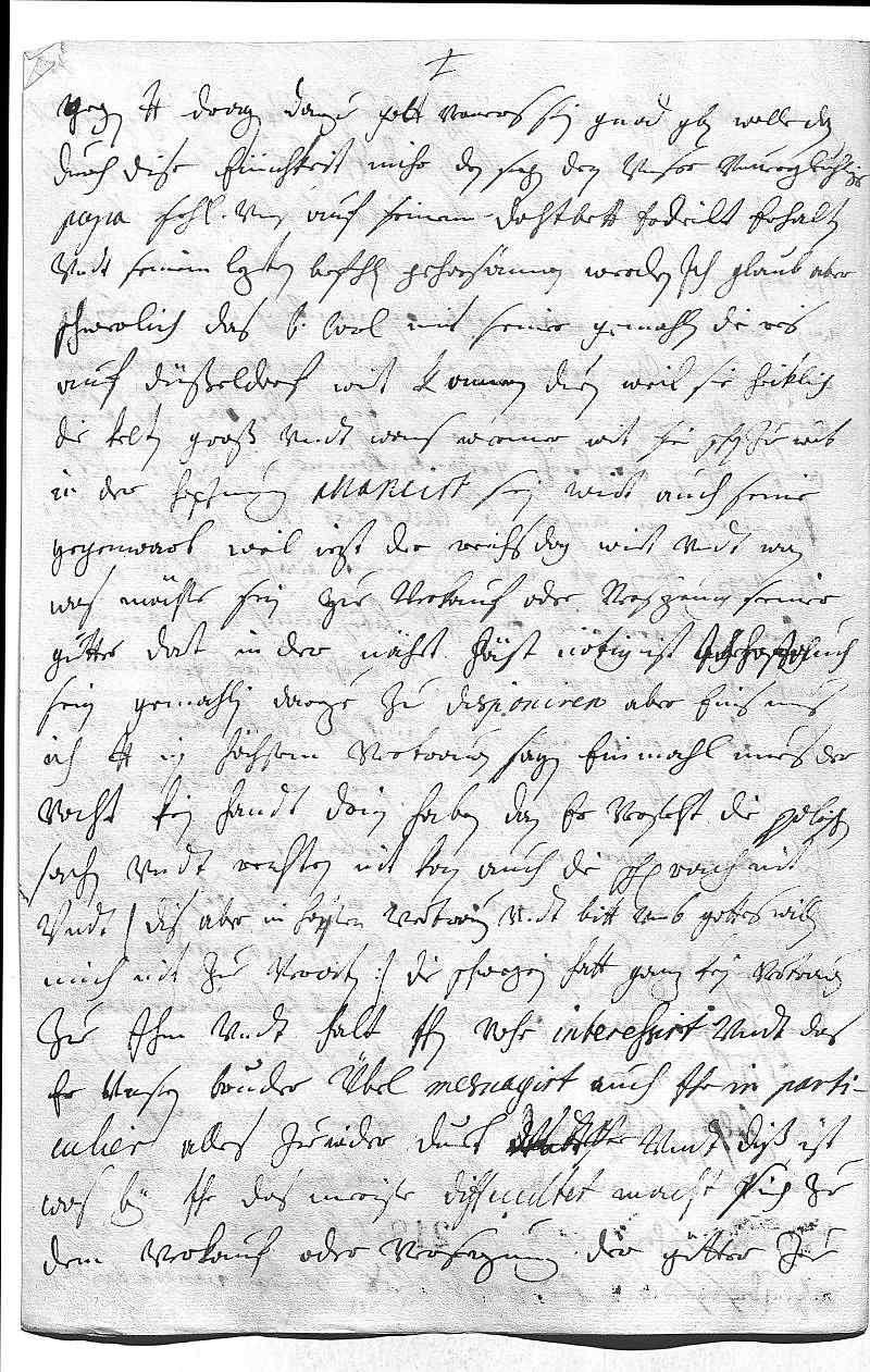 0063gegen dero Liebden dragen, darzue gott verners sein gnad geben wolle, dan 0064durch dise einichkeit mihr den segen, den vnser vnuergleuchliger 0065papa sehliger vns auf seinem dohtbett erdeilt, erhalten 0066vndt seinem lezeten befehl gehorsammen werden. Ich glaub aber 0067schwerlich, das bruder Carl mit seiner gemahlin die reis 0068auf Düßeldorf wirt konnen duen, weil sie heiklich, 0069die kelten groß, vndt wans wermer wirt sein, schon zue weit 0070in der hoffnung auancirt sein wirt, auch seine 0071gegenwart, weil iezt der reichs dag wirt, vndt wan 0072was möchte sein zue verkauf oder versezung seiner 0073gütter dort in der nähet höst nötig ist. Ich hoff auch, 0074sein gemahlin darzue zue disponiren, aber eins mus 0075ich dero Liebden in höchstem vertrawen sagen, ein mahl mues der 0076Vocht kein handt drin haben, dan er versteht die polnischen 0077sachen vndt rechten nit, kan auch die schprach nit 0078vndt (dis aber in hösten vertrauen, vndt bitt vmb gottes willen 0079mich nit zue veraten) die schwegrin hatt ganz kein vertrawen 0080zue ihm vndt halt ihn vohr interessirt vndt das 0081er vnsern bruder übel mesnagirt, auch ihr in parti- 0082culier alles zuewider duet ???, vndt diß ist, 0083was bey ihr das meriste difficultet macht, sich zue 0084dem verkauf oder versezung der gütter zue