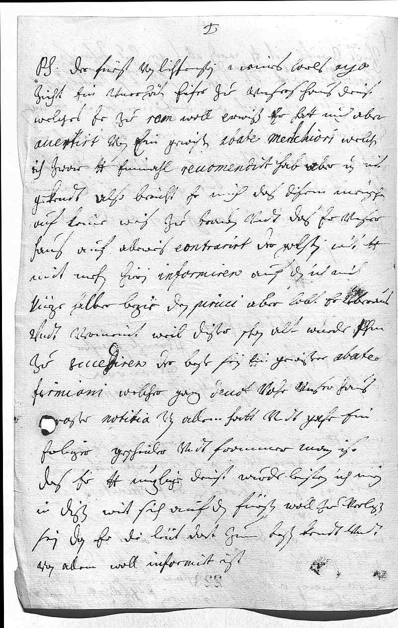 0294Postscriptum Der Fürst von Lichtenstein, meines Carls Ayo, 0295zeicht ein vnerhörten eifer zue vnsers haus dienst, 0296welches er zue Rom woll erwisen. Er hatt mich aber 0297auertirt von ein gewißen Abate Merlchiori, welchen 0298ich zwar dero Liebden einmahl reccomendirt hab, aber in nit 0299gekendt. Also bericht er mich, das disem menschen 0300auf keine weis zue trawen vndt das er vnser 0301haus auf alleweis contrarirt. Der Golstein wirt dero Liebden 0302mit mehren hierin informiren, auf den ich mich 0303kürze halber bezie. Den Piruci aber lobt er überaus 0304vndt vermeint, weil dißer schon alt wurde, ihm 0305zue sucediren. Der beste sei ein gewißer Abate 0306Firmiani, welcher ganz deuot vohr vnser haus, 0307großer notitia von allem hatt vndt gahr ein 0308erliger, gescheider vndt frommer man ist, 0309das er dero Liebden nuzlige dienst wurde leisten. Ich mein, 0310in disen wirt sich auf den Fürsten woll zue verlaßen 0311sein, dan er die leüt dort zum besten kendt vndt 0312von allem woll informirt ist.