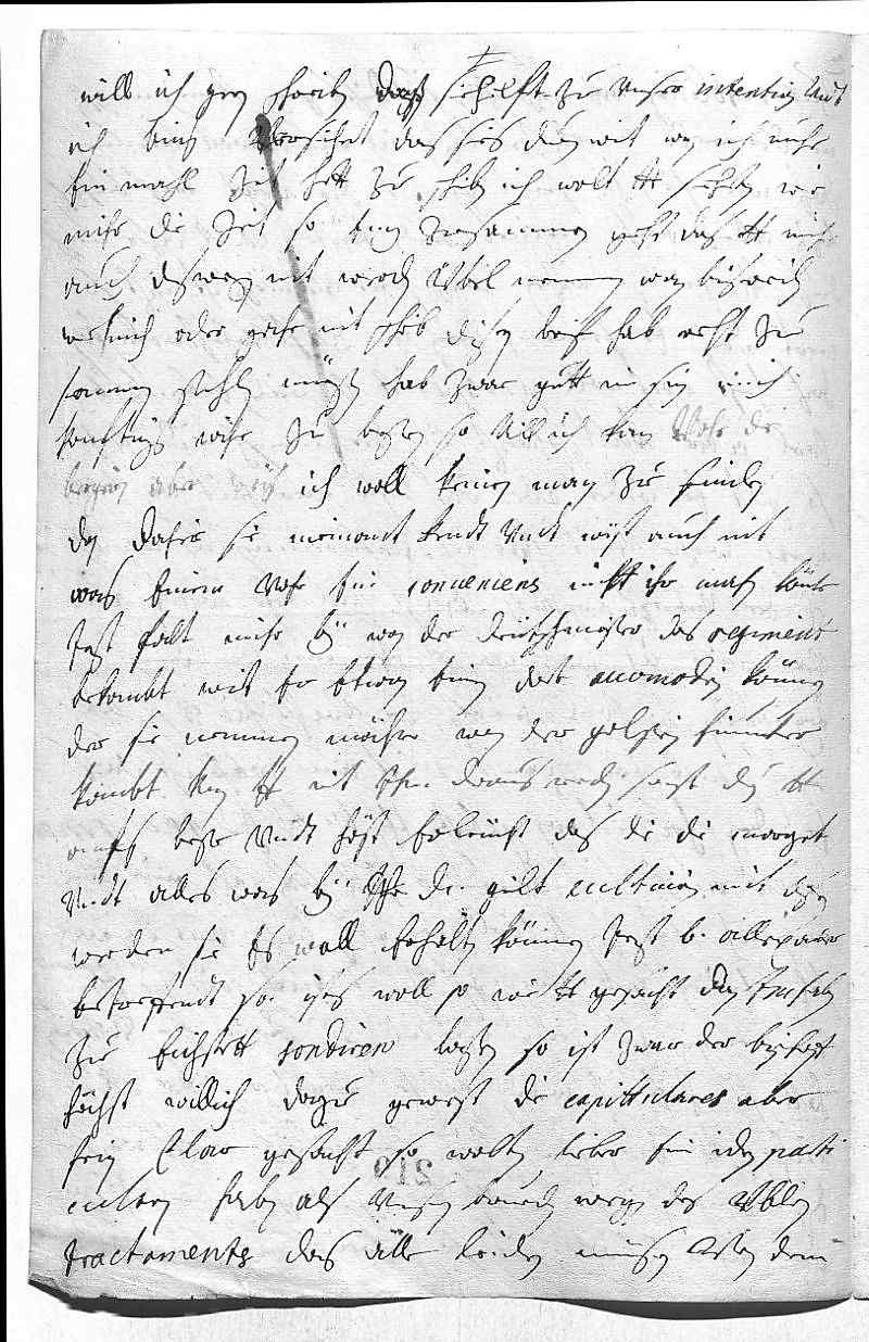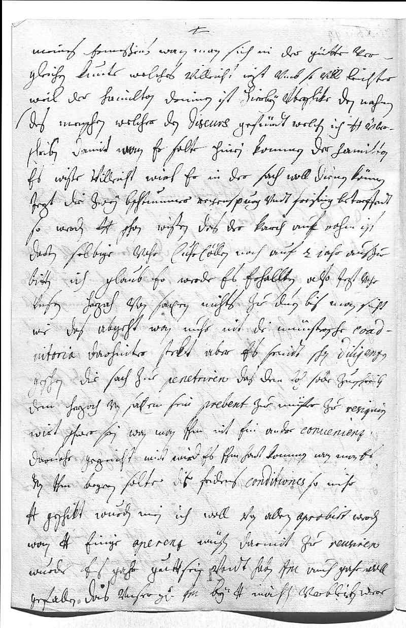 0018meines ermeßens, wan man sich in der gütte ver- 0019gleichen kunte, welches villeicht iezt vmb so vill leichter, 0020weil der Hamilton drinnen ist. Hierbey vberschike den nahmen 0021des menschen, welcher den discurs gefürdt, welchen ich dero Liebden über- 0022schriben, damit, wan er solte hinein kommen, der Hamilton 0023es wiße, villeicht wirt er in der sach woll dienen können. 0024Jezt die zwey bischtummer Regenspurg vndt Freising betreffendt, 0025so werden dero Liebden schon wißen, das der Karch auf Rohm ist, 0026dorten selbige vohr Cuhrcöllen noch auf 2 iahr auszue 0027bitten, ich glaub, er werde es erhallten, also ist jezt vohr 0028vnsern Herzoch von Saxen nichts zue duen, bis man sicht, 0029wie das abgeht. Wan nuhr nit die münstersche coad- 0030iutoria darhinter stekt, aber es seindt schon diligenzen 0031geschen, die sach zue penetriren. Das dem Loh solle zueschreiben, 0032dem Herzoch von Saxen sein prebent zue Münster zu resignirn, 0033wirt schwer sein, wan man ihm nit ein andere conuenienz 0034daruohr gezeicht wirt, wird es ihm hart kommen, wan man es 0035von im begern solte. Die fridens conditiones, so mihr 0036dero Lieben geschikt, wurden, mein ich, woll von allen aprobirt werden. 0037Wan dero Liebden einige aperenz wüsten, darmit zue reusiren, 0038wurde es gahr guettsein, vndt haben ihr Mayestät auch gahr woll 0039gefallen. Das vnser geliebste fraw mutter bey dero Liebden möchten verbleiben, were