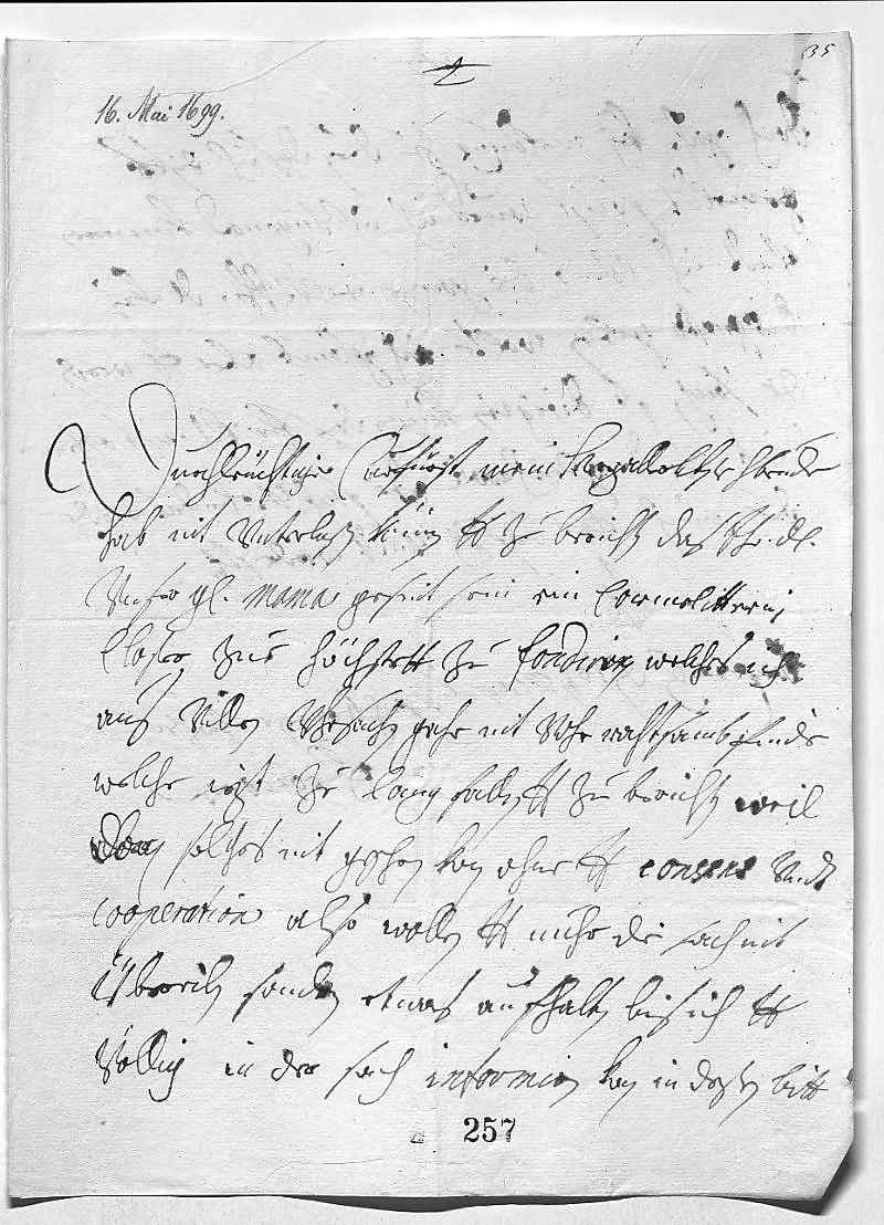 0011doch gahr kein meldung zue duen, das ich dises 0012gemeldt, sonst wurd ich in vngenad kommen, 0013vndt ich vmb die ganze weldt ihr Durchlaucht kein 0014disgusto geben wolte. Ich glaub aber, dero Liebden werden 0015die sachen so dirigiren können, das ihr Durchlaucht nit offen- 0016dirt vndt gleich woll die sach verhindert werde. 0017Due mich dero Liebden befehlen vndt werde sterben 0018dero Liebden 0019getreweste schwester 0020Eleonora 0021Laxenburg den 16ten maij 1699