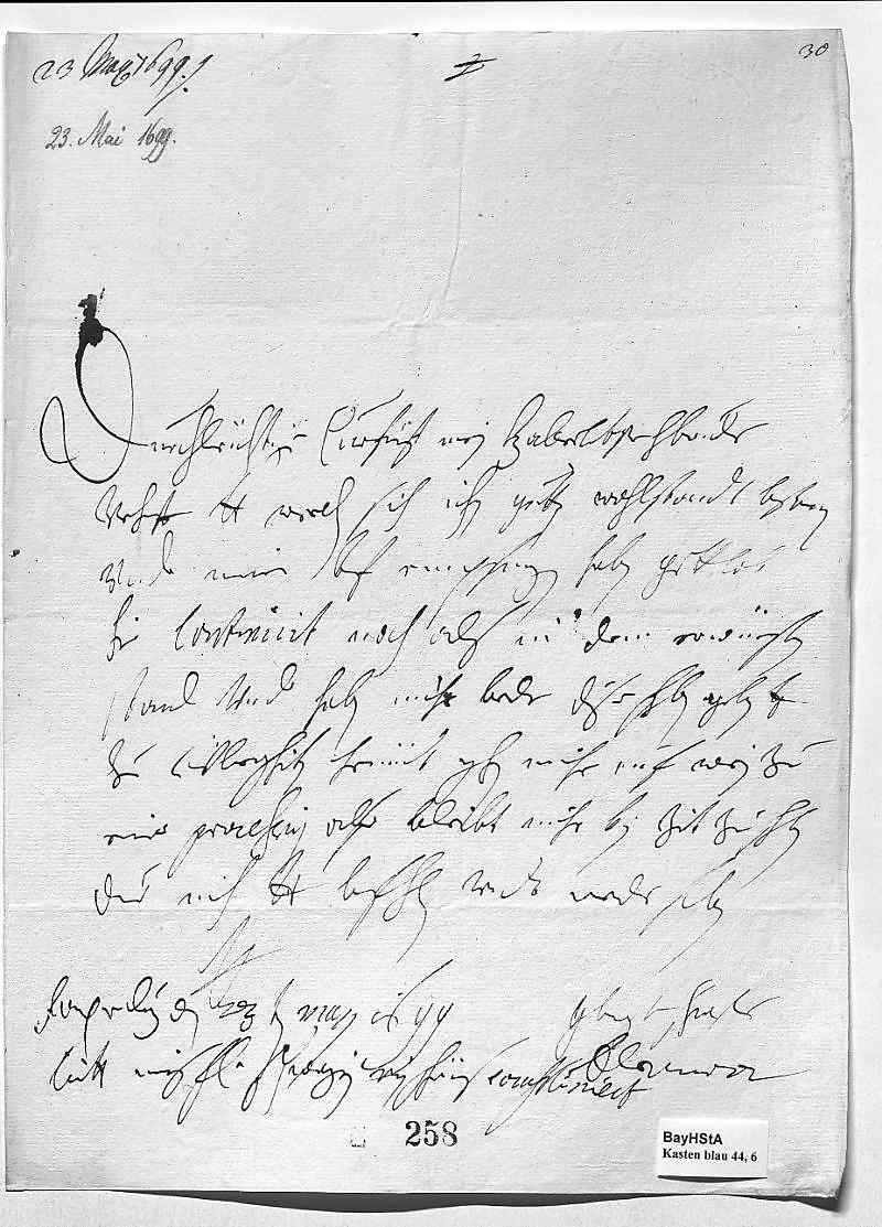 000123 maij 16990002Durchleüchtiger Curfürst, mein herzallerlibster herr bruder 0003Verhoffe, dero Liebden werden sich ihn gutten wohlstandt befinden0004vnd mein brif empfangen haben. Gottlob, 0005hie continuirt noch als in dem erwünsten 0006stand, vnd haben mihr bede dise schreiben geben g 0007zu überschiken. Heündt gehn mihr auf Wien zu 0008einer procession, also bleibt mihr kein zeit zu schreiben. 0009Due mich dero Liebden befehlen vndt werde sterben 0010dero Liebden 0011getrewste schwester 0012Eleonora 0013Laxenburg den 23ten maij 1699 0014Bitt mein fraw schwegrin ein schöns compliment zu machen.