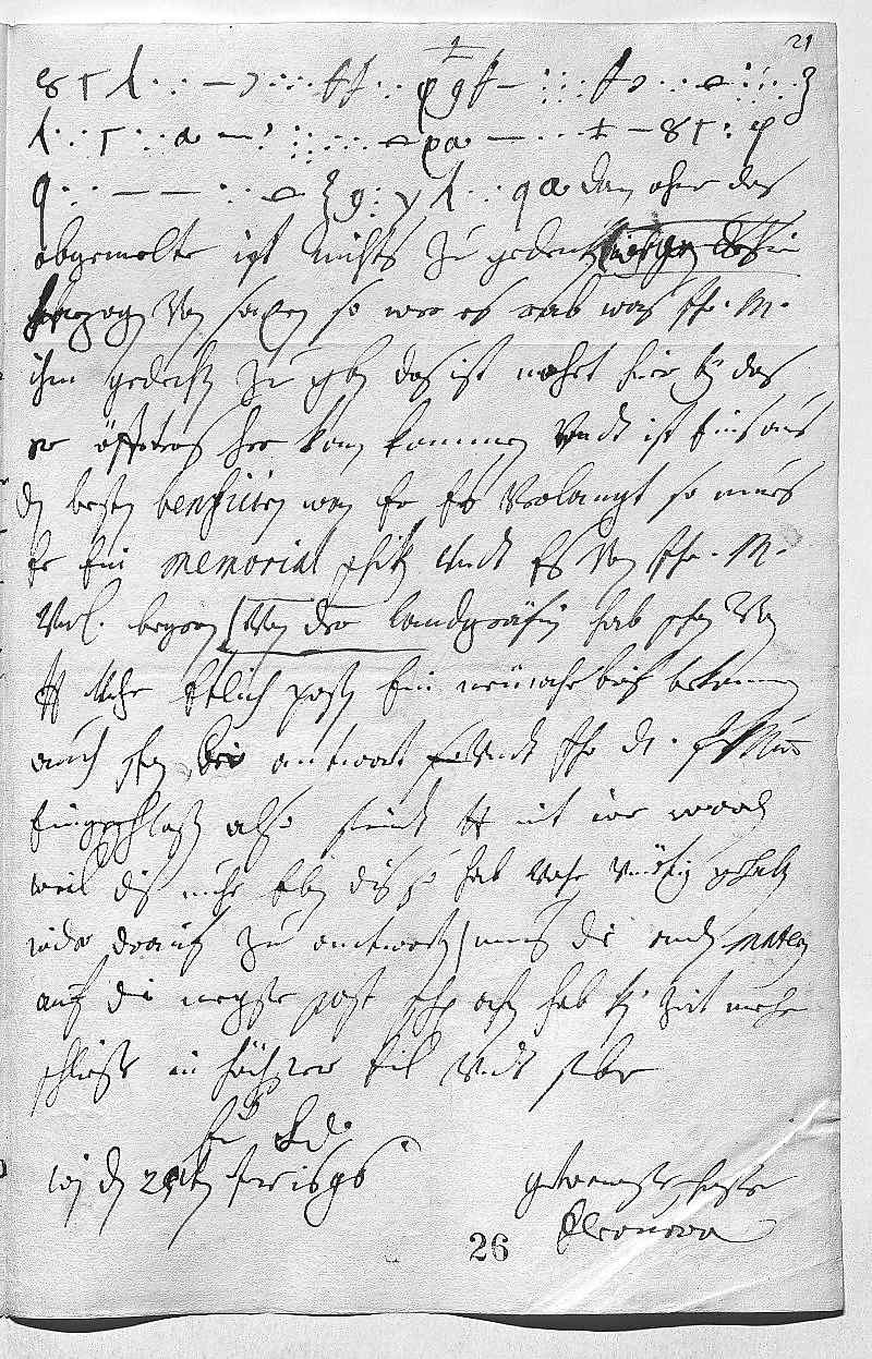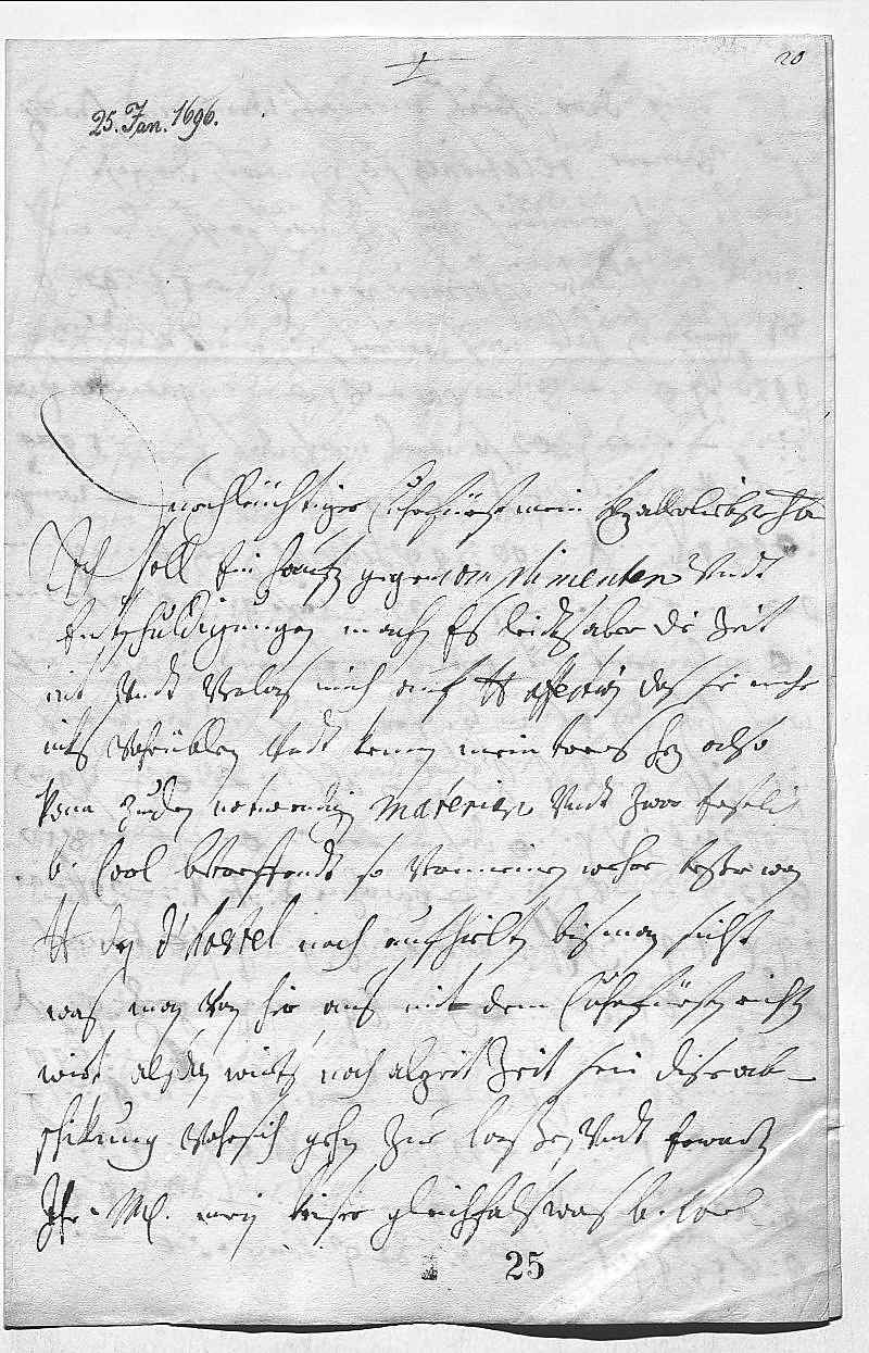 0035ch gestellen, als wolt er wek0036gehen, so werden sie schon0037besser kauf geben, dan ohne das 0038obgemelte ist nichts zu gedenken. Wegen des0039Herzogen von Saxen, so wer es Rab, was ihr Mayestät 0040ihm gedechten zu geben, das ist nahet hier bey, das 0041er öffeters her kann kommen, vndt ist eins aus 0042den besten beneficien. Wan er es verlangt, so mues 0043er ein memorial schiken vndt es von ihr Mayestät 0044vnterdehnigst begeren. Von der Landgräfin hab schon von 0045dero Liebden vohr etlich posten ein neüiahr brif bekommen, 0046auch schon be antwort so vndt ihr Durchlaucht fraw mutter 0047eingeschloßen. Also seint dero Liebden nit irr worden, 0048weil dis nuhr eben dis, so hab vohr vnötig gehalten 0049wider drauf zue antworten. Mus die andern materien 0050auf die negste post schpahren, hab kein zeit mehr. 0051Schließe in höchster eil vndt sterbe 0052euer Liebden 0053getrewste schwester 0054Eleonora 0055Wien den 25ten jener 1696