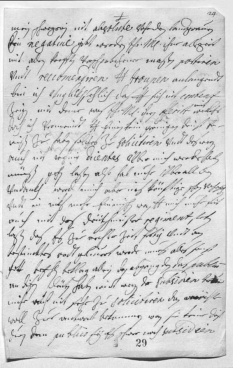 0075mein schwegerin nit alsolute vohr den Landgrauen 0076ein negatiue gibt, werden ihr Mayestät ihne allezeit 0077mit allen krefften verschprochener maßen portiren 0078vndt reccomendiren. Dero Liebden troupen anlangendt, 0079bin ich vnglükhsehlich, das dero Liebden sich nit content 0080zeigen mit deme, was ihr Mayestät ihnen offerirt, mit welchs 0081doch ich vermeindt, dero Liebden einen kein geringen dinst er- 0082wißen zue haben, solches zu solictiren, vndt des wegen 0083auch nit wehnig dicentes über mich werde haben 0084müeßen gehn laßen. Also hab nuhr überall den 0085vndankh, werd mich aber ins könftige schon vohrsehen 0086vndt in niks mehr einmischen. Wan dero Liebden mich nuhr nit 0087auch mit des Deütschmeister regiment steken 0088laßen, das es zue rechter zeit fertig vndt an 0089bestimbtes ordt geliuert werde. Mues alles sonst 0090gott befehlen, beklag allein den abgang, den das publicum 0091an disen leüten haben wirt. Wegen der subsidien traue 0092mihr auch nit sehr zu solicitiren, dan möchte 0093woll zur antwort bekommen, wan sie keine dienst 0094duen dem publico, sey es schwer, noch subsidien