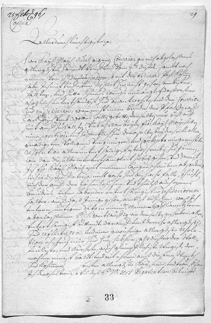 Johann Wilhelm von Pfalz-Neuburg an Eleonora Magdalena von Pfalz-Neuburg, Düsseldorf am 1696.02.25