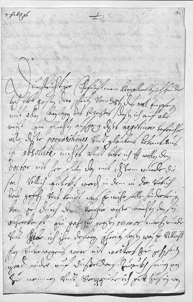 00017 februarij 960002Durchleüchtiger Cuhrfürst, mein herzallerlibster herr bruder 0003Ich hab gestern dero schreiben vom 28ten dis1 woll empfangen 0004mit allen beylagen des Pater Wißers, deßen ich auf alle 0005weiß ein schlechten ausgang dißes negotium beförchte. 0006Alle diße propositiones vndt glaubens bekantnus 0007ist absolute nichts, vndt bitte ich, dero Liebden wollen den 0008Doctor nit her schiken, dan mit dißem wurde die 0009sach völlich entekt werden, in dem in der Vrbich 0010dort gesehen vndt kendt. Was er mihr solle hinderbringen, 0011kan er durch der Kanzler Wißer berichten, dan sein 0012anherokonft ein gahrzue großen rumor machen wurde, 0013vndt habe ich ihm deswegen schreiben laßen, wan er villeicht 0014schon vnterwegens were, nit weiters zue gehen, sondern 0015grad wider auf Düßeldorf zurukh seinen weg 0016zue nemmen. Vndt vermeinte ich gutt zuesein, wan