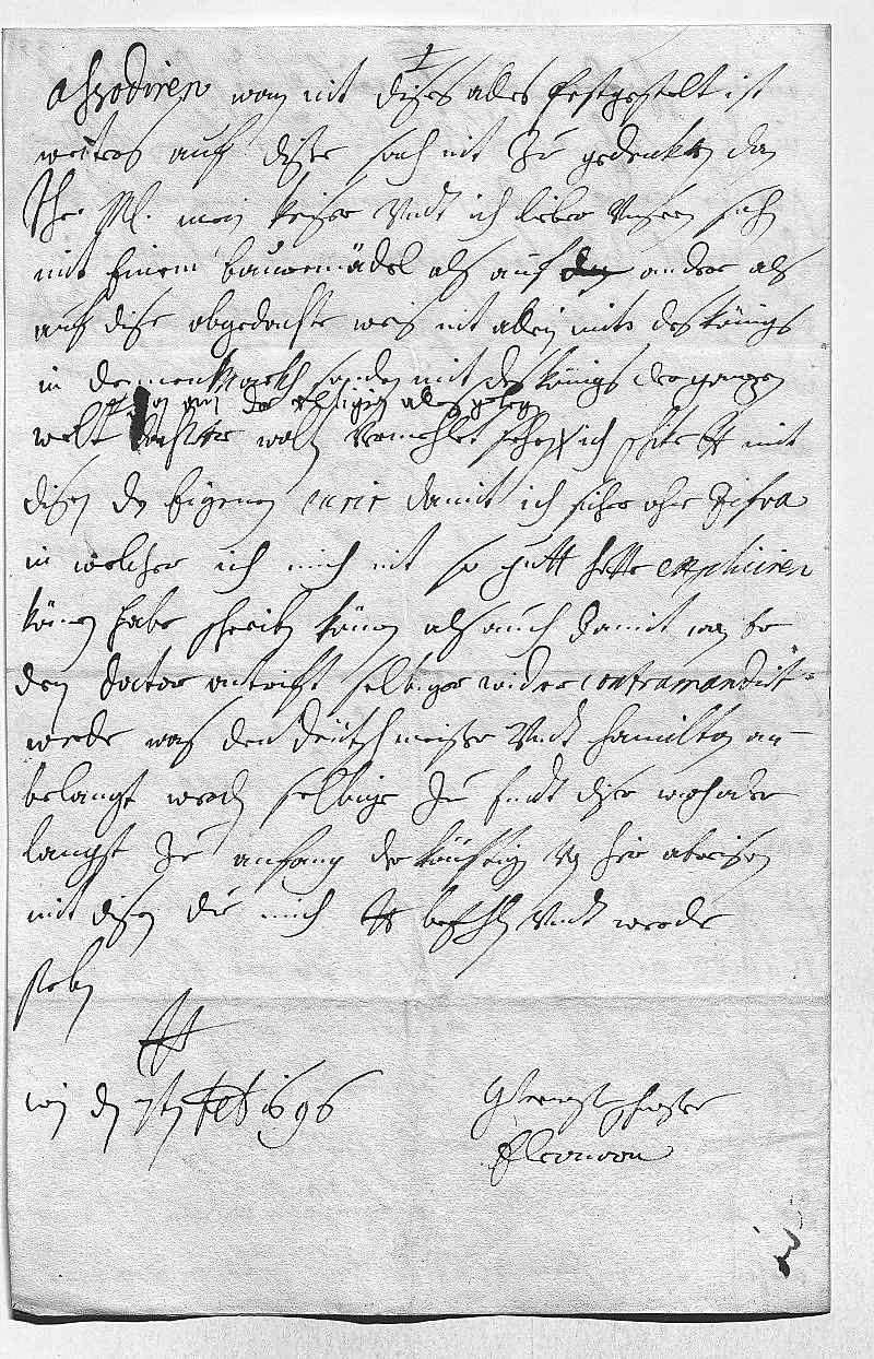 0038assodiren, wan nit dises alles festgestelt ist, und0039weiters auf diße sach nit zue gedenken, dan 0040ihr Mayestät, mein Keiser, vndt ich lieber vnseren sohn 0041mit einem baurenmädel als auf dan andere als 0042auf dise obgedachte weis, nit allein mit des Königs 0043in Dennenmarkh, sondern mit des Königs der ganzen 0044welt dochter wolten vermehlet sehen, dan an der religion alles gelegen. Ich schike dero Liebden mit 0045disen den eigenen curir, damit ich sicher ohne zifra, 0046in welcher ich mich nit so gutt hette expliciren 0047können, habe schreiben können, als auch damit, wan er 0048den Doctor antrift, selbiger wider contramandirt 0049werde. Was den Deütschmeister vndt Hamilton an- 0050belangt, werden selbige zue endt diser woch oder 0051langst zue anfang der könftigen von hier abreisen. 0052Mit disen due mich dero Liebden befehlen vndt werde 0053sterben 0054dero Liebden 0055getrewste schwester 0056Eleonora 0057Wien den 7ten februarij 1696