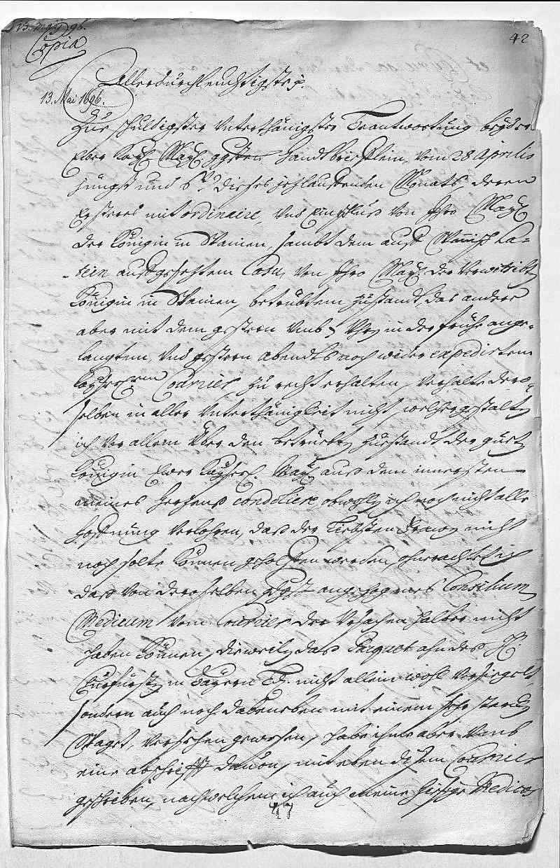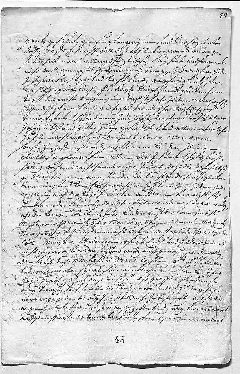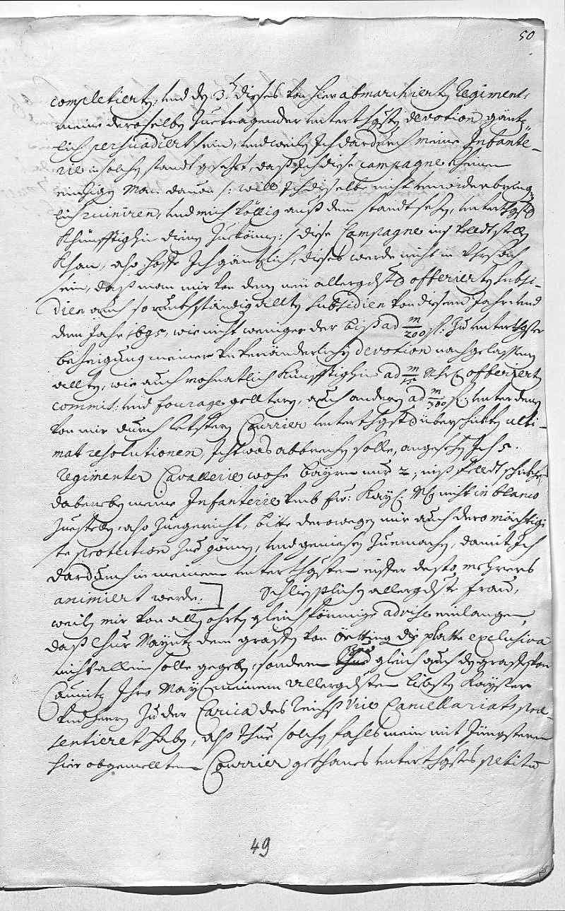 Drückt sein Beileid zum traurigen Gesundheitszustand der verwitweten spanischen Königin aus und wird auch die Meinung seiner eigenen Ärzte und Chirurgen einholen. Hat bereits den berühmten Arzt und Chirurgen Doktor Ruffini nach Spanien geschickt. – Hofft, dass die Brüder schon in Wien sind. Bittet zu verhindern, dass die kaiserlichen Minister Bruder Karl (Philipp) mit der Herzogin von Arenberg verkuppeln, da ihre Aussichten nicht den Nachteil ihrer Verwandtschaft mit kaiserlichen Ministern aufwiegen. – Das neue Regiment ist nun mit 600 Mann komplett und wird am 3. Mai abmarschieren. Wird seine dadurch geschwächte Infanterie in diesem Feldzug nicht einsetzen können und hofft, dass dies den ausstehenden Subsidienzahlungen keinen Abbruch tun wird. – Wiederholt seine Empfehlung des Grafen Kaunitz für die Reichsvizekanzlerstelle.