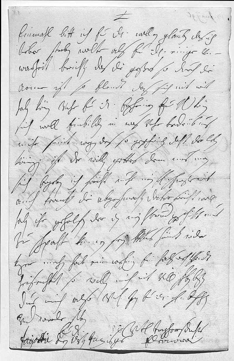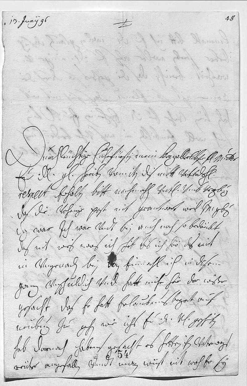 0014Einmahl bitt ich, ewer Durchlaucht wollen glauben, das ich 0015lieber sterben wolte, als ewer Durchlaucht einige vn- 0016warheit berichten, das die Geßers so durch ??. Die 0017arme ist so elendt, das sih nit wirt 0018haben können vohr ewer Durchlaucht erscheinen. Ewer Durchlaucht können 0019sich woll einbilden, in was vohr bedrübnus 0020mihr seint wegen des so geschwinden doht der lieben 0021Königin, ist der willen gottes, dem mus man 0022sich ergeben. Ich förcht nuhr, mein fraw schwester wirt 0023auch krankh, die abgeschmachten doctor, förcht woll, 0024haben ihr geholfen, der, den mein herr bruder geschikt, mus 0025zu schpaht kommen sein. Mus heüdt wider 0026kürzer machen, hab ein wehnig ein hals weh vndt 0027heisenhkeit, so wollen mich nit vill schreiben laßen. 0028Due mich also vnterdehnigst in ewer Durchlaucht gnade befehlen 0029vnd werde sterben 0030ewer Durchlaucht 0031vnterdehnigste trewgehorsamste dochter 0032Eleonora 0033Fauorita den 13ten junij 1696