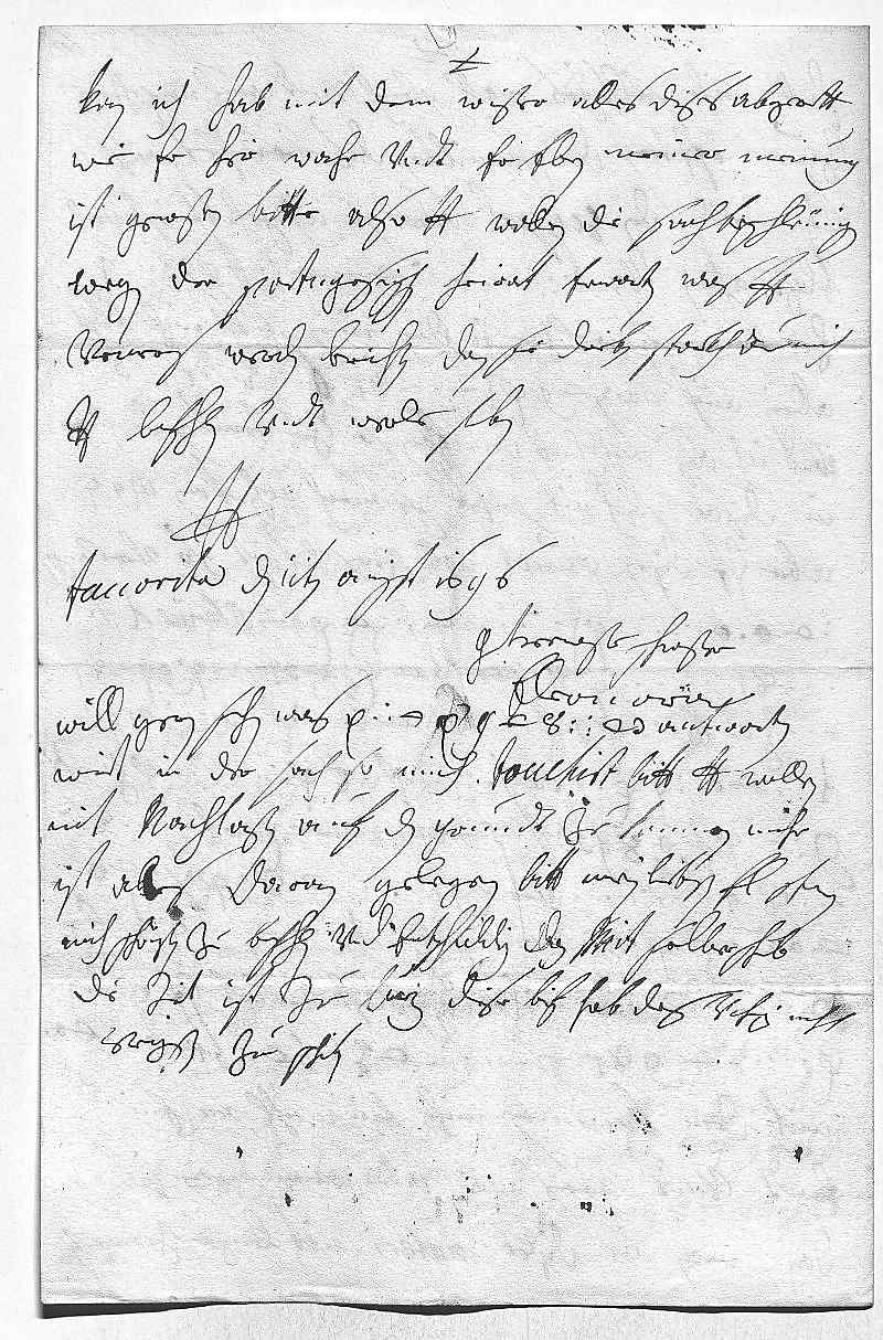 0056kan. Ich hab mit dem Wißer alles dises abgerett, 0057wie er hier wahr, vndt er eben meiner meinung 0058ist geweßen, bitte also, dero Liebden wollen die sach beschleünigen. 0059Wegen der portugesischen heirat erwarten wir, was dero Liebden 0060verners werden berichten, dan sie dreiben starkh. Due mich 0061dero Liebden befehlen vndt werde sterben 0062dero Liebden 0063getrewste schwester 0064Eleonora 0065Fauorita den 11ten august 1696 0066Will gern sehn, was d'Arcourt antworten 0067wirt in der sach, so mich touchirt, bitt, dero Liebden wollen 0068nit nachlaßen auf den grundt zu kommen, mihr 0069ist alles daran gelegen. Bitt mein liebsten fraw schwegerin 0070mich schönsten zu befehlen vnd zu entschuldigen, das nit selber schreib, 0071die zeit ist zue curz. Dise brif hab das vohrig mahl 0072vergeßen zue schiken.