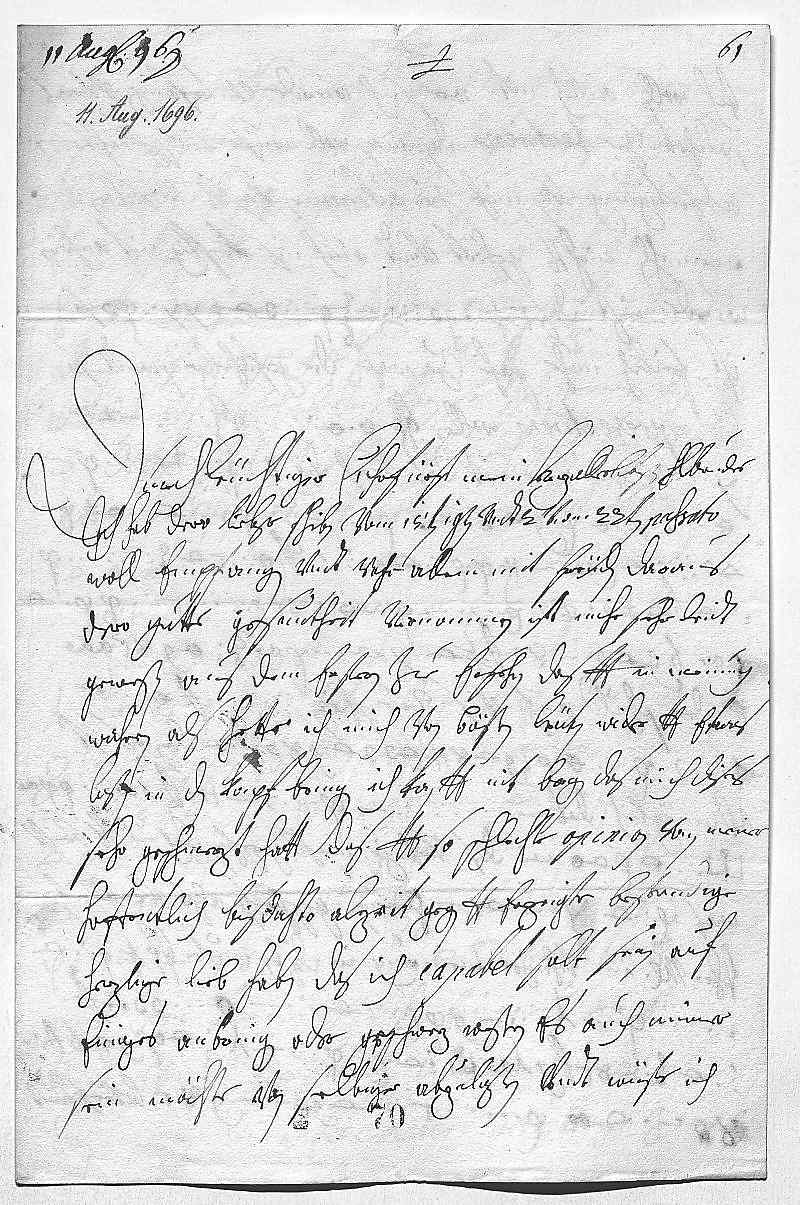 000111 august 960002Durchleüchtiger Cuhrfürst, mein herzallerlibster herr bruder 0003Ich hab dero liebste schreiben vom 15ten, 19ten vnd 2 vom 22ten passato 0004woll empfangen vndt vohr allem mit freüden daraus 0005dero gutte gesuntheit vernommen. Ist mihr sehr leidt 0006geweßen, aus dem erstern zue ersehn, das dero Liebden in meinung 0007wahren, als hette ich mich von bößen leüten wider dero Liebden etwas 0008laßen in den kopf bringen. Ich kan dero Liebden nit bergen, das mich dises 0009sehr geschmerzt hatt, das dero Liebden so schlechte opinion von meiner 0010hoffentlich bis dahto alzeit gegen dero Liebden erzeigte bestendige 0011herzlige lieb haben, das ich capabel solt sein, auf 0012einiges anbringen oder geschwez, weßen es auch immer 0013sein möchte, von selbiger abzulaßen, vndt wüste ich