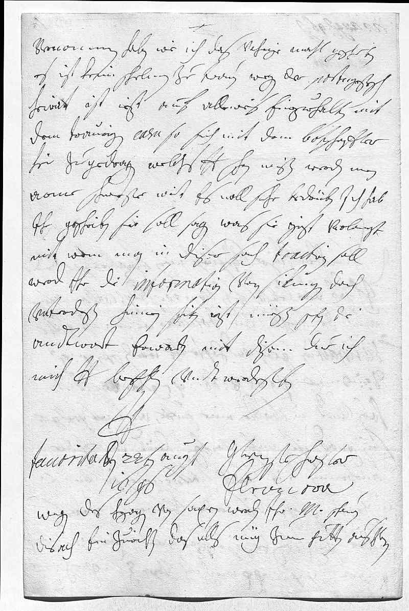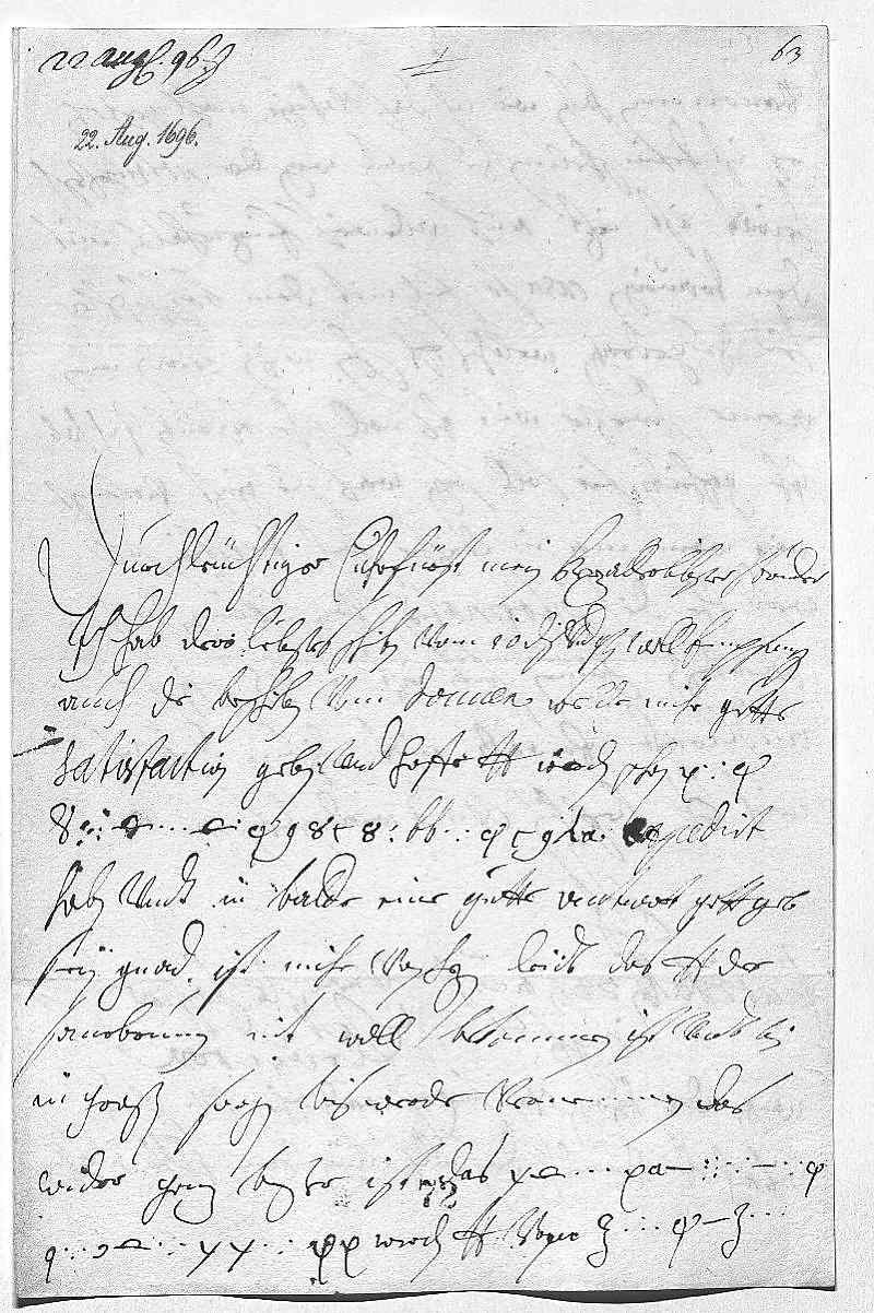 0013vernommen haben, wie ich das vohrige mahl geschriben, 0014es ist keinem schelmen zu trawen. Wegen der portugeßeschen 0015heirat ist iezt auf alleweis einzuehalten mit 0016dem traurigen casu, so sich mit dem Botschaffter 0017hir zugedragen, welchs dero Liebden schon wißen werden. Mein 0018arme schwester wirt es woll sehr bedrüben. Ich hab 0019ihr geschriben, sie soll sagen, was sie jezt verlangt, 0020mit wem man in diser sach tractiren soll, 0021werd ihr die information von Sikingen doch 0022vnterdeßen hinnein schiken, iezt müeßen schon die 0023andtwort erwarten. Mit disem due ich 0024mich dero Liebden befehlen vndt werde sterben 0025dero Liebden 0026getrewste schwester 0027Eleonora 0028Fauorita den 22ten august 00291696 0030Wegen des Herzogen von Saxen werden ihr Mayestät schawen, 0031disach ein zurichten, das alls mög zum gutten ausschlagen.