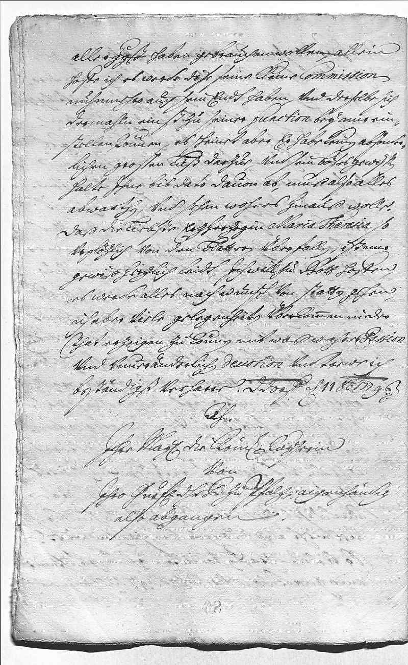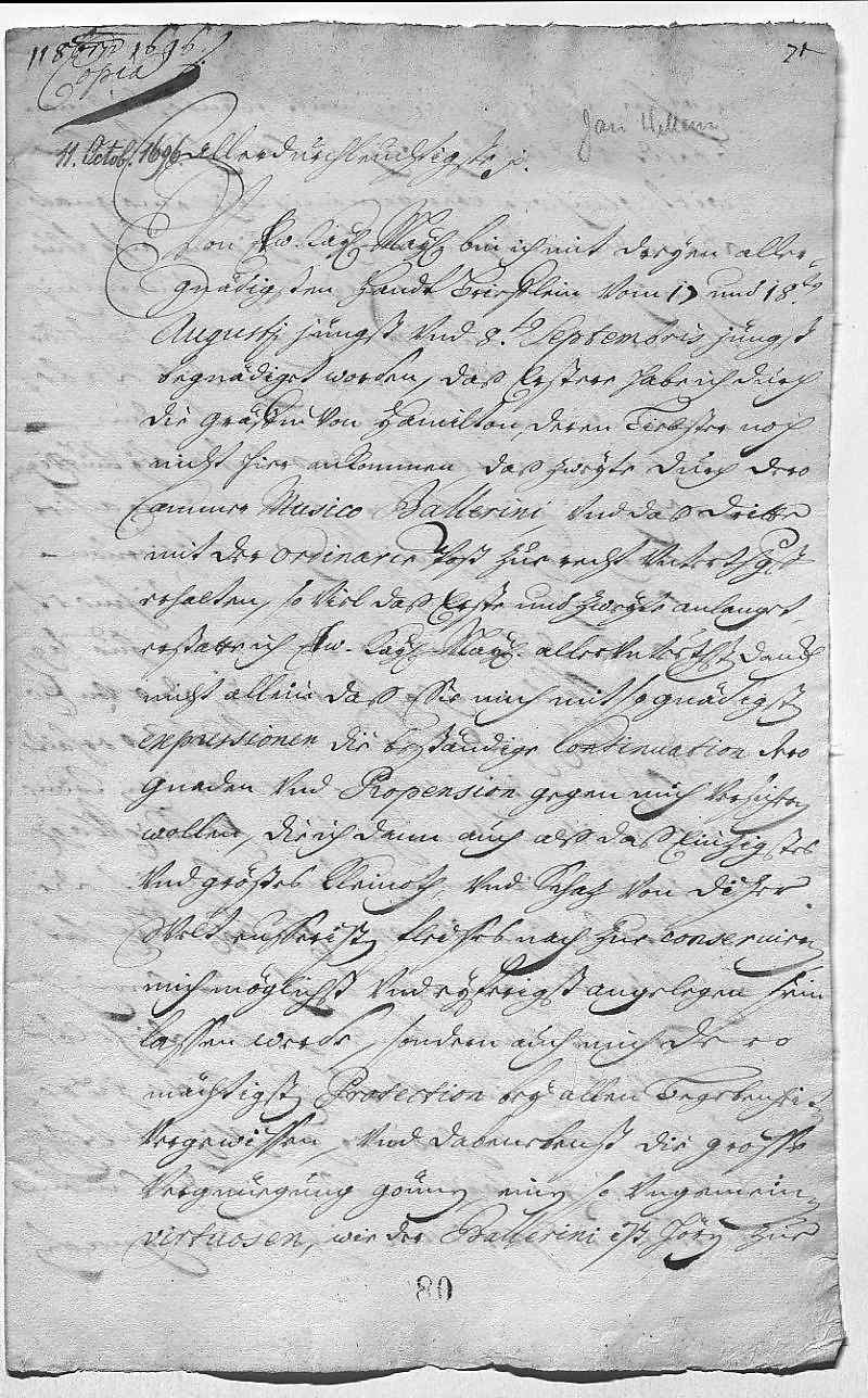 Dankt für die anhaltende Gnade und Protektion EMTs. Bittet, dass EMTs Kammermusiker Ballerini bis zum nächsten Fasching dableiben darf, um bei einer kleinen Oper aufzutreten. – Dankt dafür, dass EMT den Grafen Lamberg beim Kaiser empfehlen will. – Bedauert den Tod des Grafen Heißler von Heitersheim und bittet, keinesfalls einen der Grafen von Schallenberg zu seinem Nachfolger zu ernennen. – Weil durch den Tod des Grafen Heißler und des Generals Bolland zwei Regimenter frei werden, wird EMT sicher den konvertierten Landgrafen Philipp (von Hessen-Darmstadt) bedenken. Es tröstet JW, dass die Schlacht (bei Olasch in Ungarn) noch relativ gut ausgegangen ist. – Wird so bald wie möglich weitere Informationen über die Vermögensverhältnisse der Prinzessinnen von Hessen-Rheinfels schicken. – Wartet auf einen Gesandten des (dänischen) Königs aus Kopenhagen. – Kann nicht glauben, dass der Kaiser sich die Friedensverhandlungen so leicht von Mächten (England und den Vereinigten Niederlanden) aus der Hand nehmen lässt, die das Reich sofort ihren Interessen opfern werden. Rät, umgehend unter der Hand Gespräche mit Frankreich über eine Wiedereinsetzung König Jakobs (II. von England und Schottland) und vorteilhafte Friedensbedingungen aufzunehmen. – Bittet im Konflikt JWs und der oberrheinischen, westerwäldischen und wetterauischen Stände mit dem Landgrafen (von Hessen-Kassel) um die oberrheinische Kreisverfassung um die Unterstützung des Kaisers. – Wiederholt die Bitte um Anweisung der 5.000 Dukaten für Bruder Karl (Philipp). EMT wird diesem die polnische Krone umso mehr gönnen, als das pfälzische Kurhaus dem Kaiser so viele Opfer gebracht hat, Prinz Jakob (Sobieski) ohnehin keine Chancen hat und der Herzog von Lothringen nur wenige. – Herzog Christian August von Sachsen-Zeitz war bei JW und hat ihm gesagt, dass kaiserliche Minister in Köln an der Wiedereinsetzung der fürstenbergischen Parteigänger („Kreaturen“) arbeiten. – Hofft, dass Graf Hamilton bald zurückkehrt. – Bedauert von Herzen, dass Erzherzogin Maria Theresia so plötzlich von den Blattern überfallen wurde.
