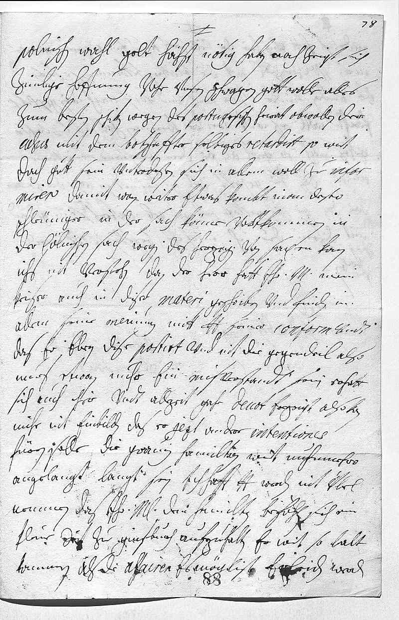 0034zur polnischen wahl gelt höchst nötig haben. Noch zeigt sich 0035zimlige hoffnung vohr vnsren schwagren, gott wolle alles 0036zum besten schiken. Wegen des portugesischen heirat, obwollen der 0037casus mit dem Botschaffter selbiges retardirt, so wirt 0038doch gutt sein, vnterdeßen sich in allem woll zue infor- 0039miren, damit, wan weiter etwas kombt, man desto 0040schleüniger in der sach könne vortkommen. In 0041der cölnischen sach wegen des Herzogen von Saxen kan 0042ichs nit verstehn, dan der herr hatt ihr Mayestät, mein 0043Keiser, auch in diser materi geschriben, vnd finden in 0044allem seine meinung mit dero Liebden seiner conform vndt 0045das er eben dise portirt vnd nit die gegendeil, also 0046mues etwan nuhr ein misverstandt sein. Erhatt 0047sich auch hier vndt allzeit gahr deuot erzeigt, also kan 0048mihr nit einbilden, das er jezt andere intentiones 0049füren solle. Die Grauin Hamilton wirt nuhnmehro 0050angelangt längst sein, ich hoff, dero Liebden werden nit übel 0051nemmen, das ihr Mayestät dem Hamilton befohlen, sich ein 0052kleine zeit zue Ginsburch aufzuehalten, er wirt so balt 0053kommen, als die affairen es möglist erleiden werden.