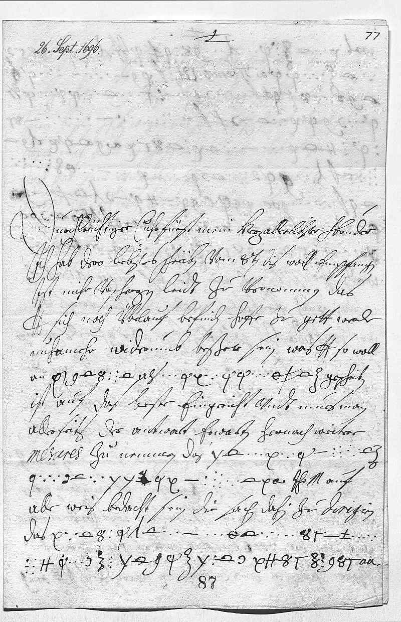 0001Durchleüchtiger Cuhrfürst, mein herzallerliebster herr bruder 0002Ich hab dero liebstes schreiben vom 8ten dis woll empfangen. 0003Ist mihr von herzen leidt zu vernemmen, das 0004dero Liebden sich noch übelauf befinden, hoffe zu gott, es werde 0005nuhnmehr widerumb beßer sein. Was dero Liebden so woll 0006an d'Arcour als in Dennemark geschriben, 0007ist auf das beste eingericht vndt mues man 0008allerseits der antwort erwarten, hernach weitere 0009mesures zu nemmen. Das fridenswerk 0010betreffend, so werden ihr Mayestät auf 0011alle weis bedacht sein, die sachen dahin zu dirigiren, 0012das der congres im Reich seie, 0013wo nit zu Frankfort, so doch zu Achen.