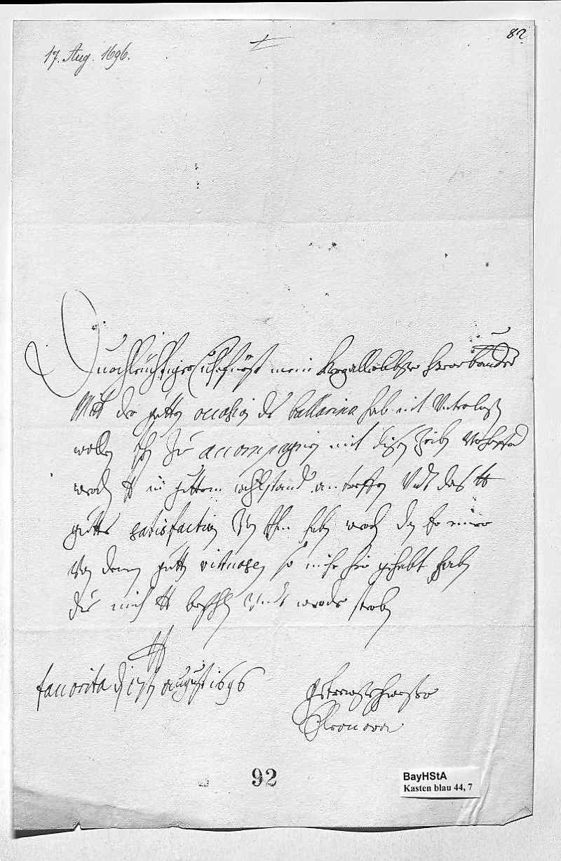 0001Durchleüchtiger Cuhrfürst, mein herzallerlibster herr bruder 0002Mitt der gutten occasion des Ballarino hab nit vnterlaßen 0003wollen, ihn zu accompagniren mit disen zeilen, verhoffend, 0004sie werden dero Liebden in guttem wohlstand antreffen, vndt das dero Liebden 0005gutte satisfaction von ihm haben werden, dan er einer 0006von denen gutten virtuosen, so mihr hir gehabt haben. 0007Due mich dero Liebden befehlen vndt werde sterben 0008dero Liebden 0009getrewste schwester 0010Eleonora 0011Fauorita dn 17ten august 1696