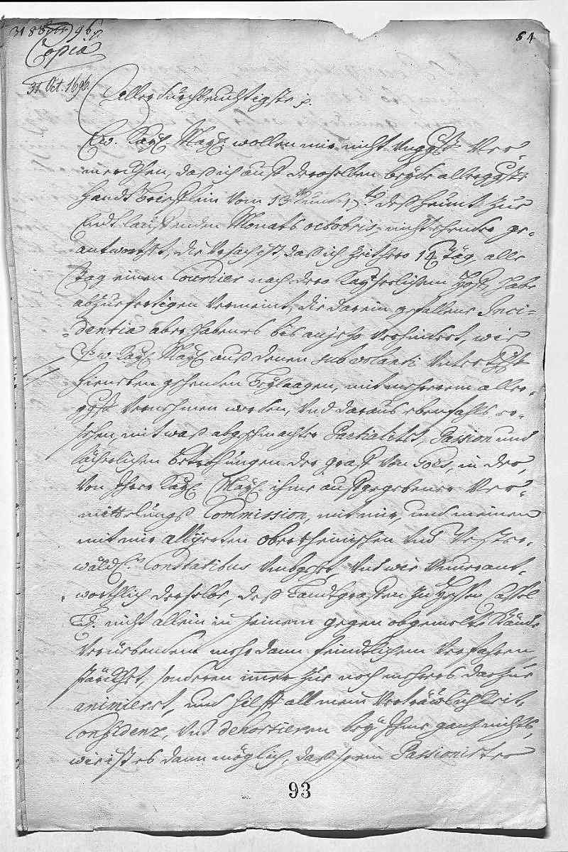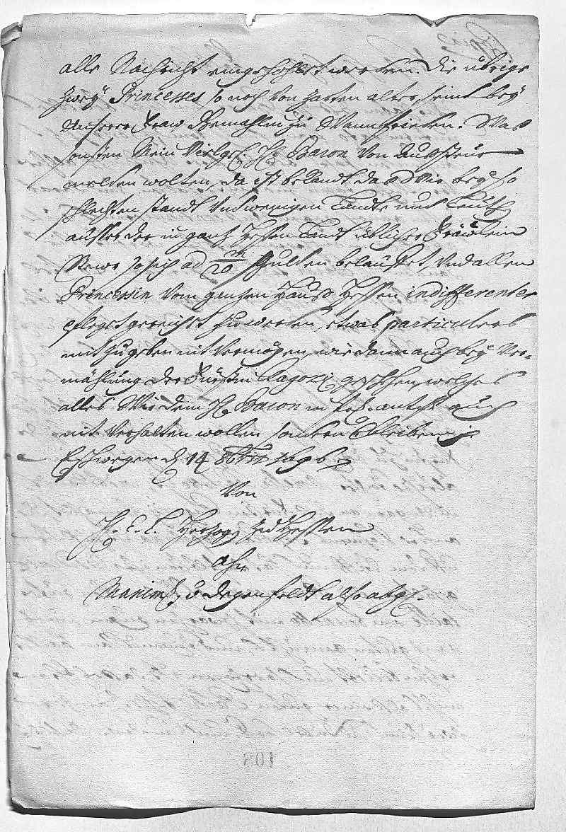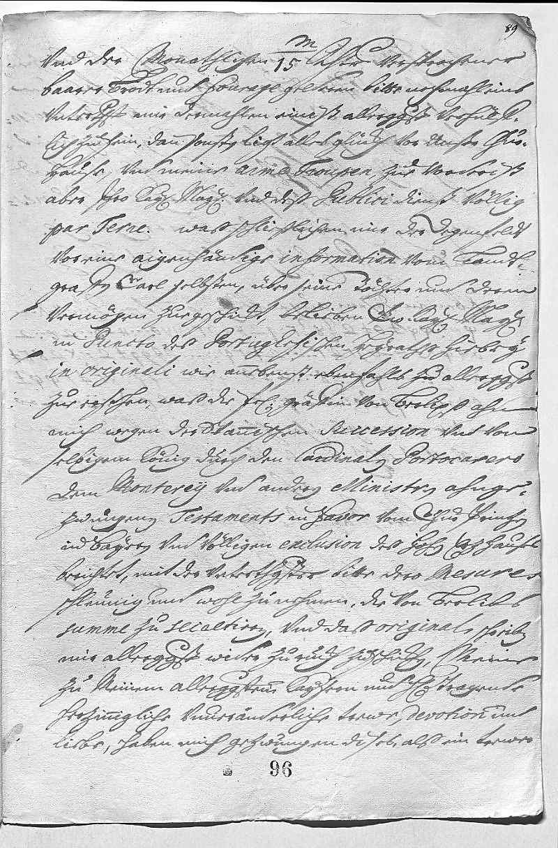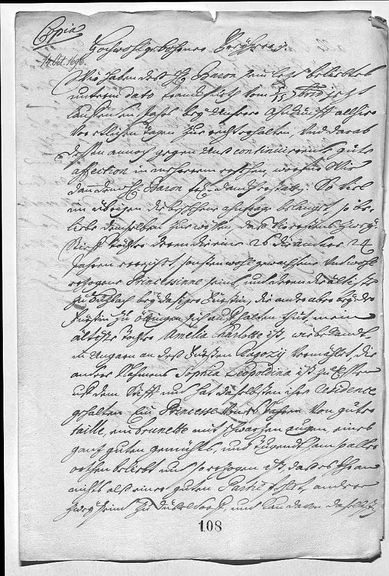 EMT kann aus den Beilagen sehen, wie parteilich und mit welchen lächerlichen Drohungen Graf Goes JW und den mit ihm alliierten oberrheinischen und westerwäldischen Ständen im Rahmen seiner kaiserlichen Kommission begegnet, und wie er den Landgrafen von Hessen-Kassel in seinem feindseligen Verfahren gegen die genannten Stände noch bestärkt. Hat gehört, dass Graf Goes vom Landgrafen 50.000 Gulden oder Reichsthaler erhalten haben soll. Es schmerzt JW, dass man sich nicht an das mit ihm Vereinbarte hält, obwohl er dem Kaiser, dem Publikum und der Religion große Opfer gebracht hat. – Über den Doktor (Schweizer) hat die Mutter an JW einen ähnlichen Brief geschrieben wie an EMT; JW hat alles geleugnet. – Erwartet in der dänischen Heiratssache täglich einen Gesandten aus Kopenhagen. – Sendet einen Bericht aus guter Quelle über das Verhalten des Herzogs von Sachsen(-Zeitz) . – Wiederholt seine Bitte wegen der Gelder für Bruder Karl (Philipp) und seine Truppen. – Sendet beiliegend, was Landgraf Karl (von Hessen-Rheinfels) über seine Töchter und deren Vermögen an den Degenfeld geschrieben hat. – Sendet einen Bericht der Gräfin Berlepsch über das Testament des spanischen Königs, das den bayerischen Prinzen bevorzugt und das Erzhaus ausschließt. Bittet, der armen verfolgten spanischen Königin (Schwester Maria Anna) beizustehen. – Eben kommt der Obersthofmeister Geismar der dänischen Königin an, JW wird berichten.
